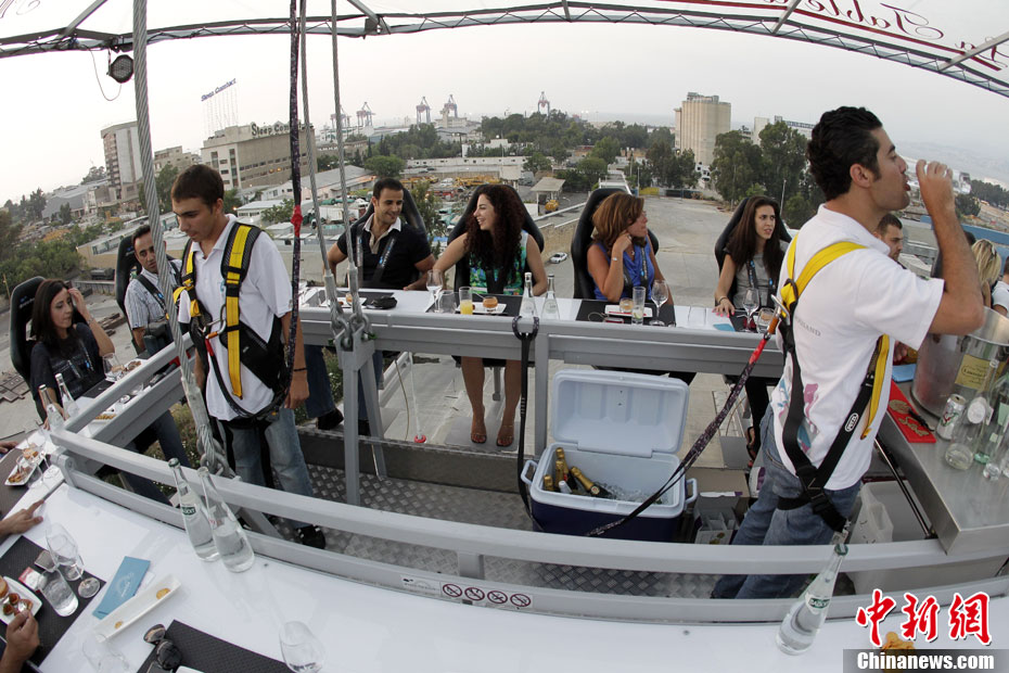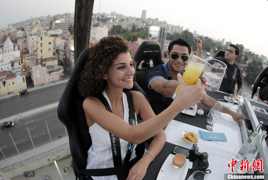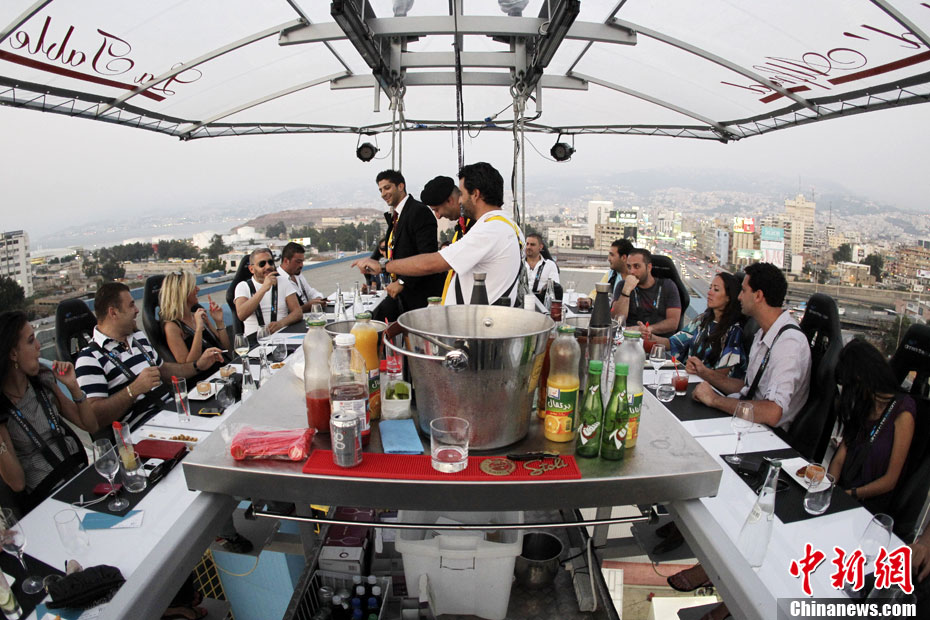7月10日,黎巴嫩貝魯特22名賓客圍坐在被起重機(jī)吊起50米的餐桌旁享用“空中晚宴”。