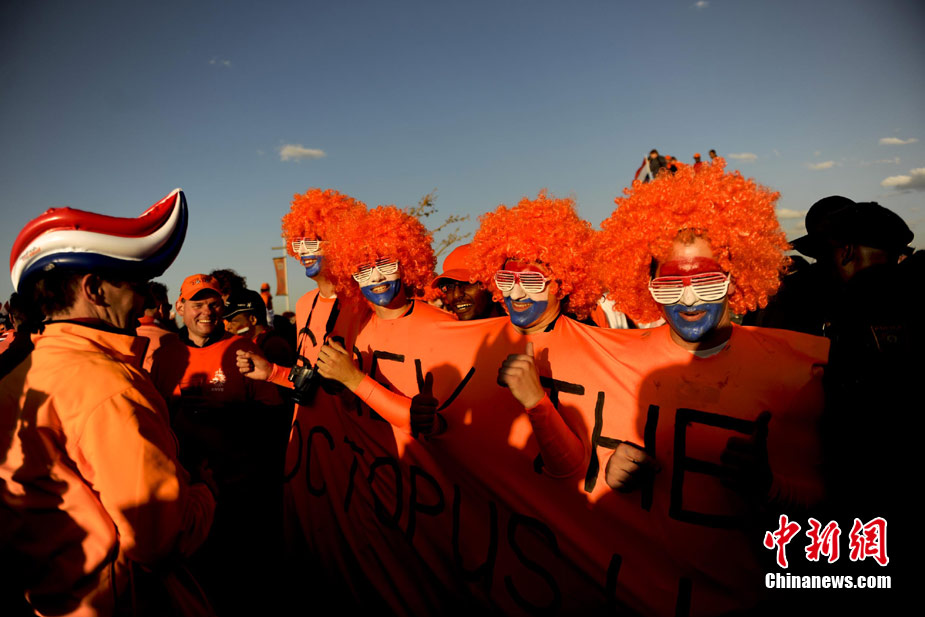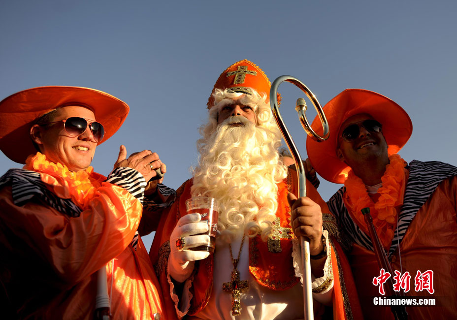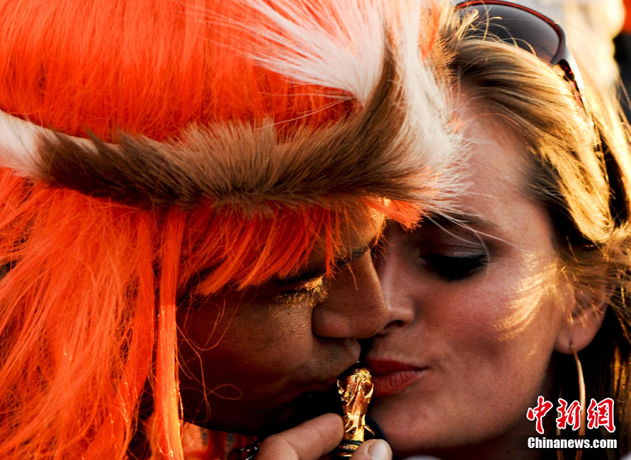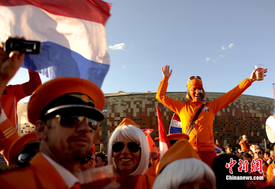 7月11日,南非約翰內(nèi)斯堡足球城,眾多荷蘭球迷在足球城球場外激情舞蹈。當(dāng)晚,南非世界杯荷蘭對(duì)西班牙的決賽將在足球城球場舉行。中新社記者 廖攀 攝