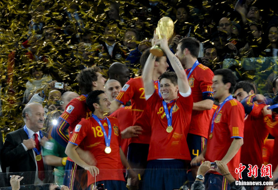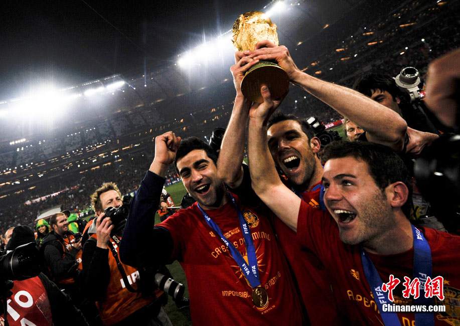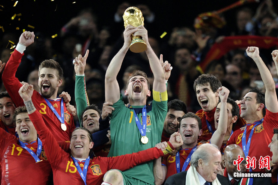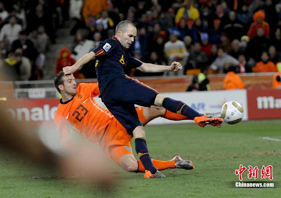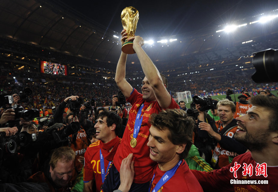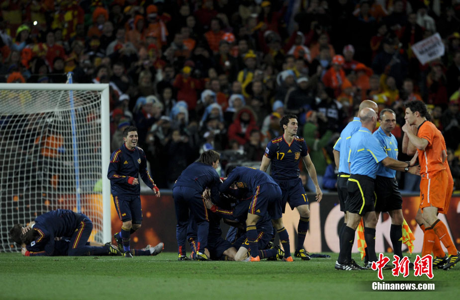 北京時(shí)間7月12日凌晨2:30,南非世界杯迎來了最終的決賽,在約翰內(nèi)斯堡的足球城球場(chǎng)由荷蘭隊(duì)對(duì)陣西班牙。最終雙方經(jīng)過120分鐘鏖戰(zhàn),伊涅斯塔在第116分鐘攻入全場(chǎng)唯一一粒進(jìn)球,絕殺十人應(yīng)戰(zhàn)的荷蘭隊(duì),史上首次奪得冠軍。