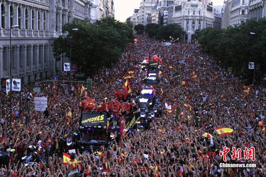西班牙隊(duì)凱旋歸國 數(shù)萬球迷游街迎英雄