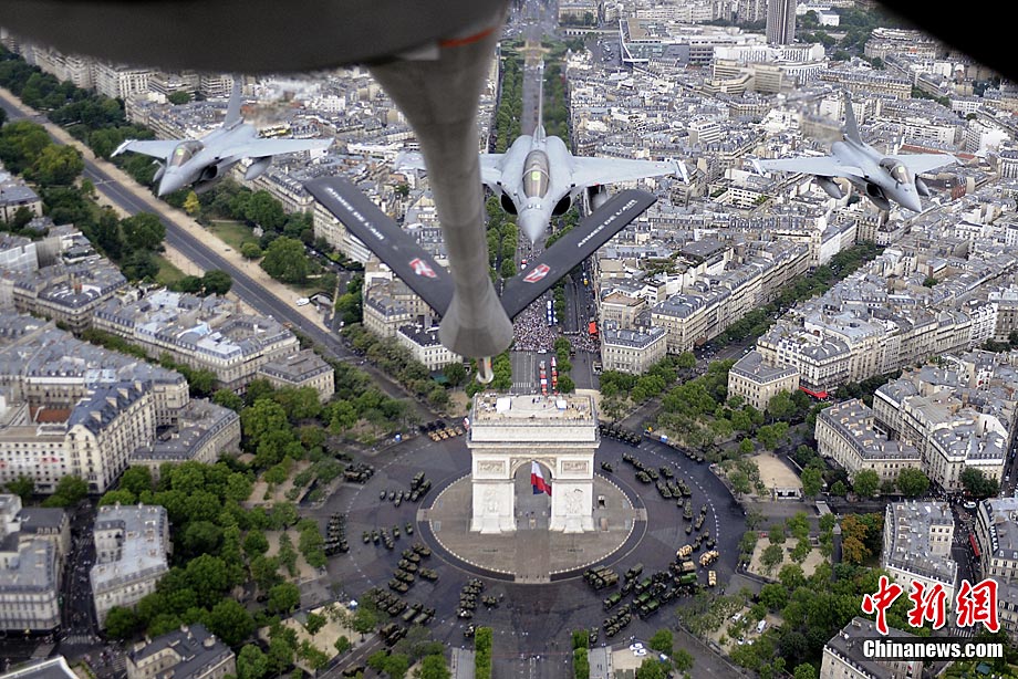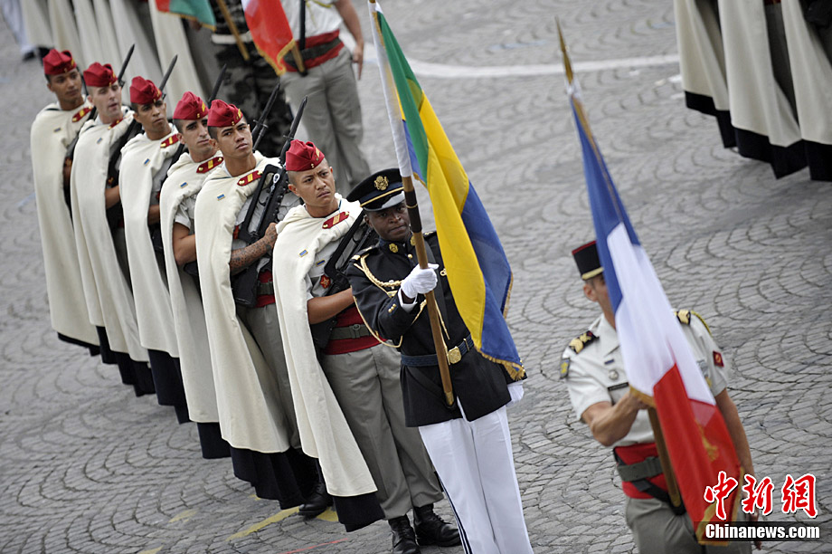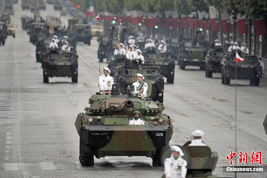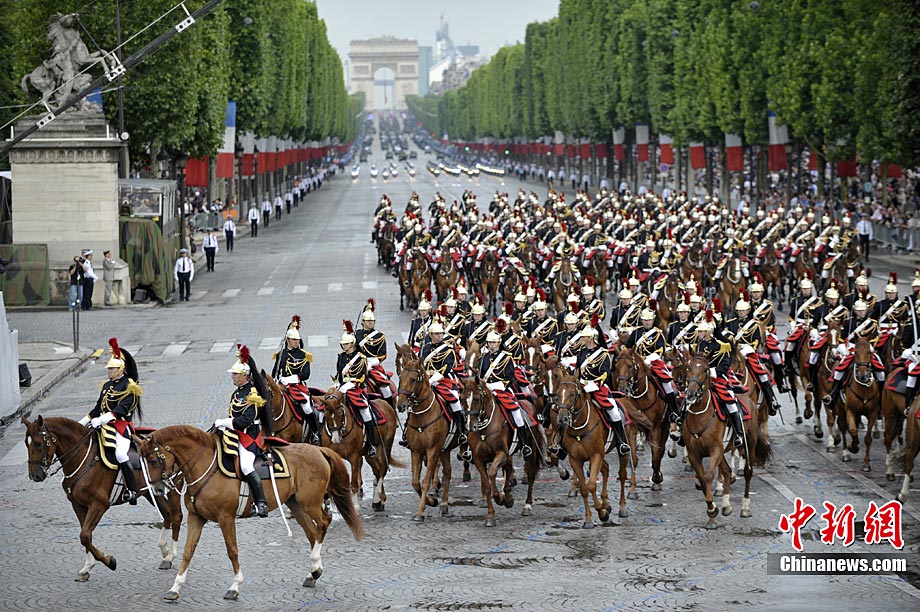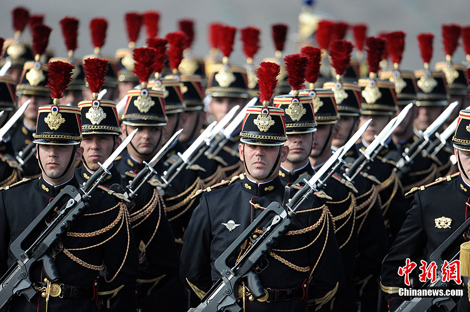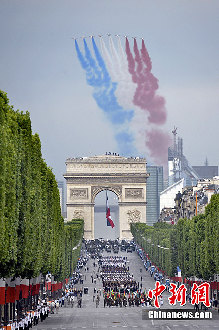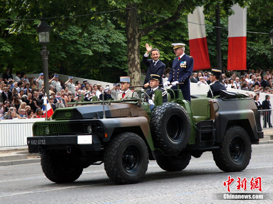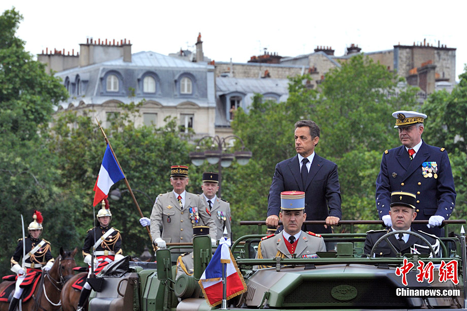 當(dāng)?shù)貢r(shí)間7月14日,法國(guó)巴黎舉行了盛大的國(guó)慶日閱兵式。圖為法國(guó)總統(tǒng)薩科齊在法國(guó)三軍總參謀長(zhǎng)愛德華·紀(jì)堯的陪同下檢閱部隊(duì)。 中新社發(fā) 吳衛(wèi)中 攝