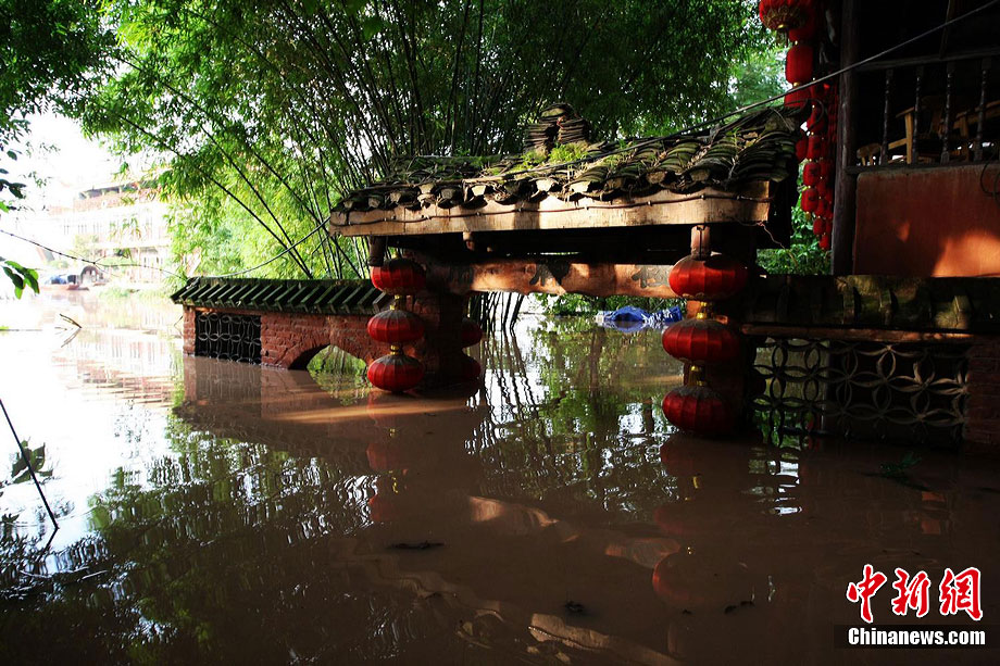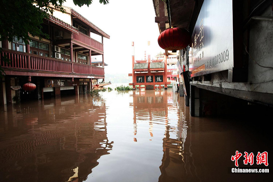 7月19日,今年入汛以來最大洪峰經(jīng)過重慶主城,長江、嘉陵江水位上漲。記者在重慶古鎮(zhèn)磁器口看到,從磁器口江邊至磁器口街道的梯坎已“隱”于水面下,標(biāo)志性牌匾龍隱門沒至“腰部”,靠近江邊的商鋪及民居被淹。目前,大部分商家、市民接預(yù)警已提前撤場歇業(yè)或撤離至安全地帶。截至記者趕赴磁器口途中,部分必經(jīng)路段已實(shí)施交通管制,磁器口正街漲水期間亦采取禁行措施。據(jù)長江水利委員會水文局監(jiān)測數(shù)據(jù),19日20時長江重慶寸灘站水位超過185米,這是重慶遭遇的長江今年以來最大洪峰。截至20日0時,長江重慶水位仍在185.06米的峰值上流動,洪峰仍在過境重慶。 劉函冉 攝