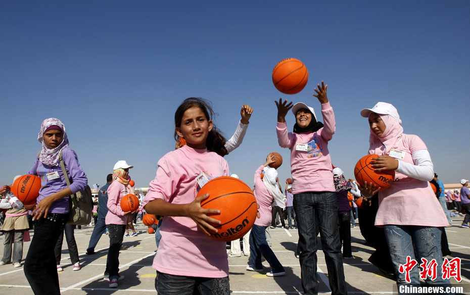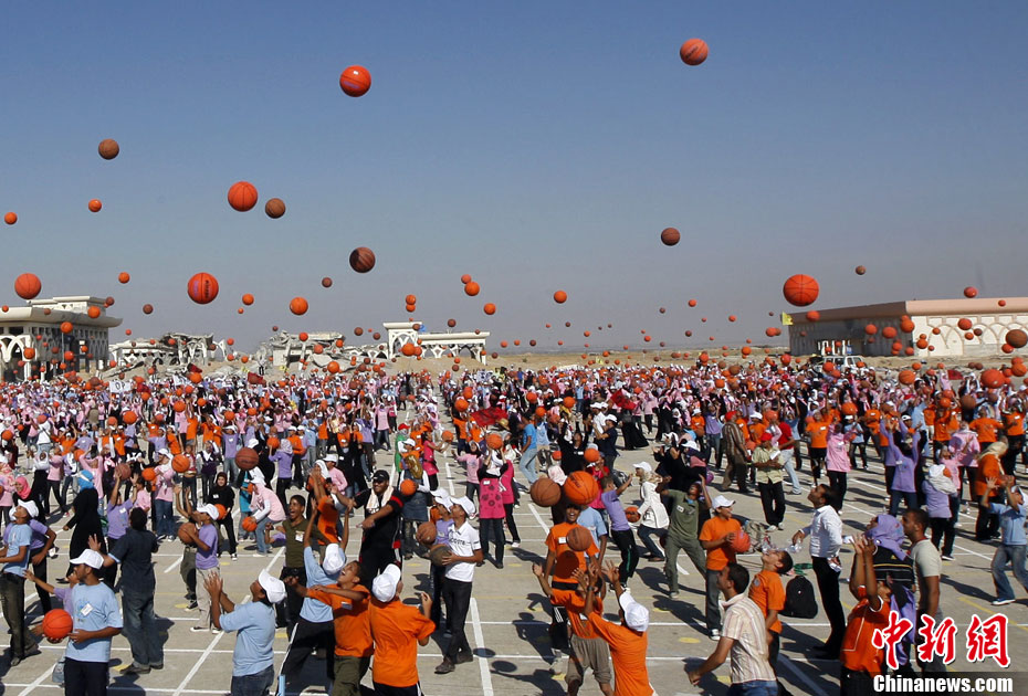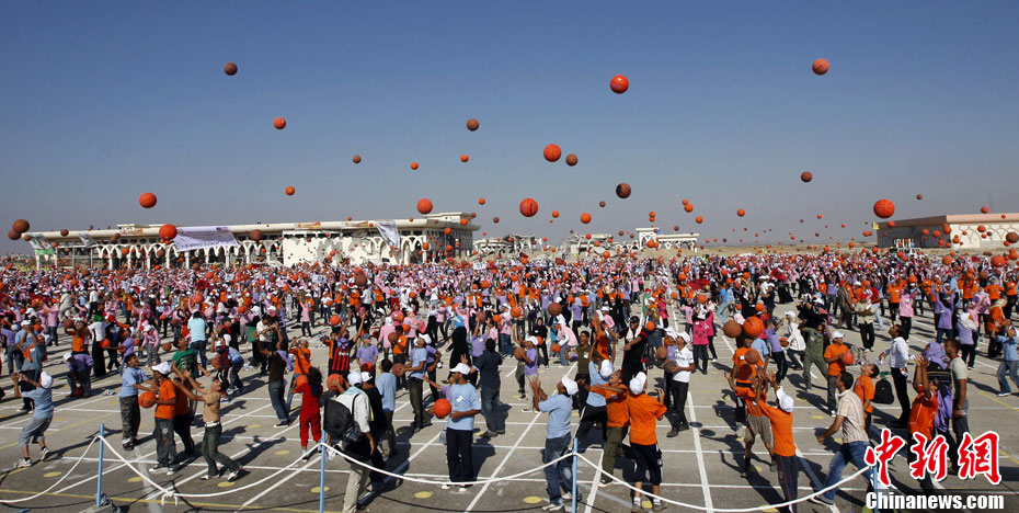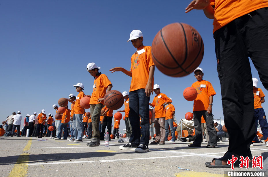 7月22日,加沙地帶7500名巴勒斯坦兒童刷新了最多人在同一地點(diǎn)同時(shí)拍籃球的吉尼斯世界紀(jì)錄。當(dāng)日,這些兒童在聯(lián)合國(guó)近東巴勒斯坦難民救濟(jì)和工程處駐加沙地帶辦事處的組織下,來(lái)到加沙地帶南部一個(gè)遭以色列轟炸后廢棄的機(jī)場(chǎng)!伴_始”的口令一發(fā)出,站成方隊(duì)的7500名兒童用單手同時(shí)拍起了籃球,連續(xù)進(jìn)行了5分鐘,創(chuàng)造了最多人在同一時(shí)間、同一地點(diǎn)拍籃球的吉尼斯世界紀(jì)錄。此前,此項(xiàng)紀(jì)錄由美國(guó)以4600多人保持。