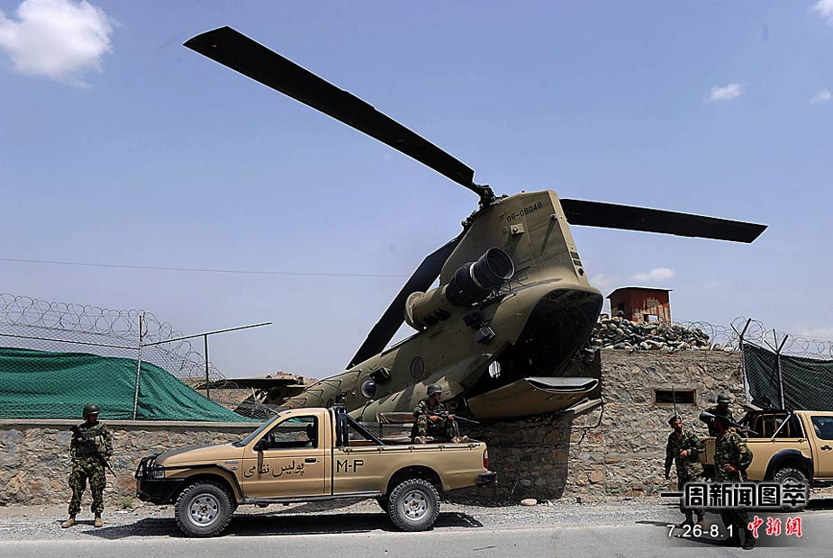 7月26日(周一),駐阿富汗國際安全援助部隊的一架“支奴干”直升機在喀布爾東部地區(qū)墜毀。圖為阿富汗國民軍士兵們正守在墜毀的直升機旁。機上四名成員只受了輕傷,飛機墜毀的原因正在調查中。
