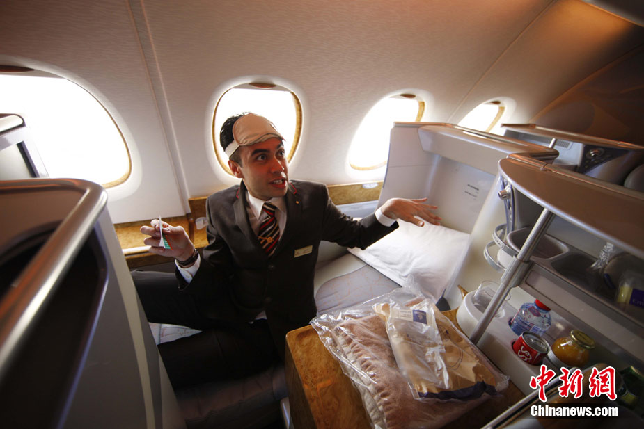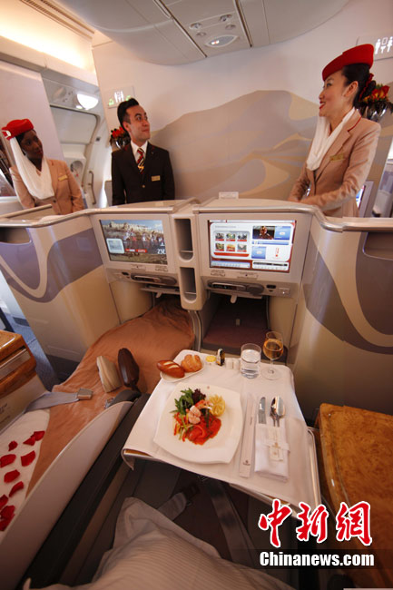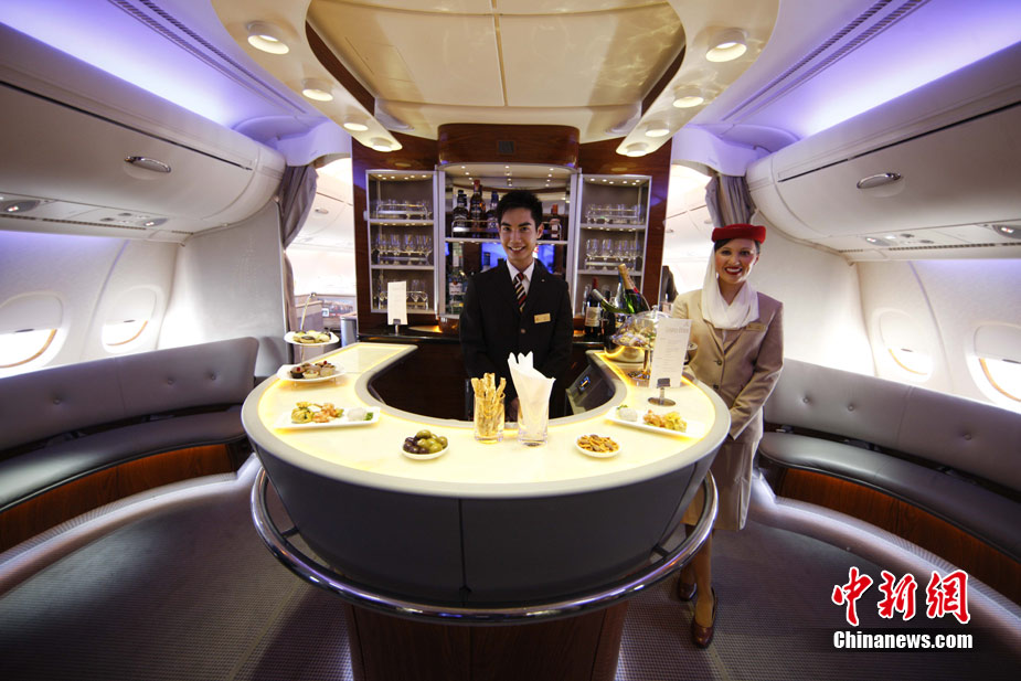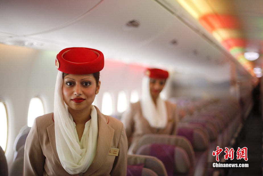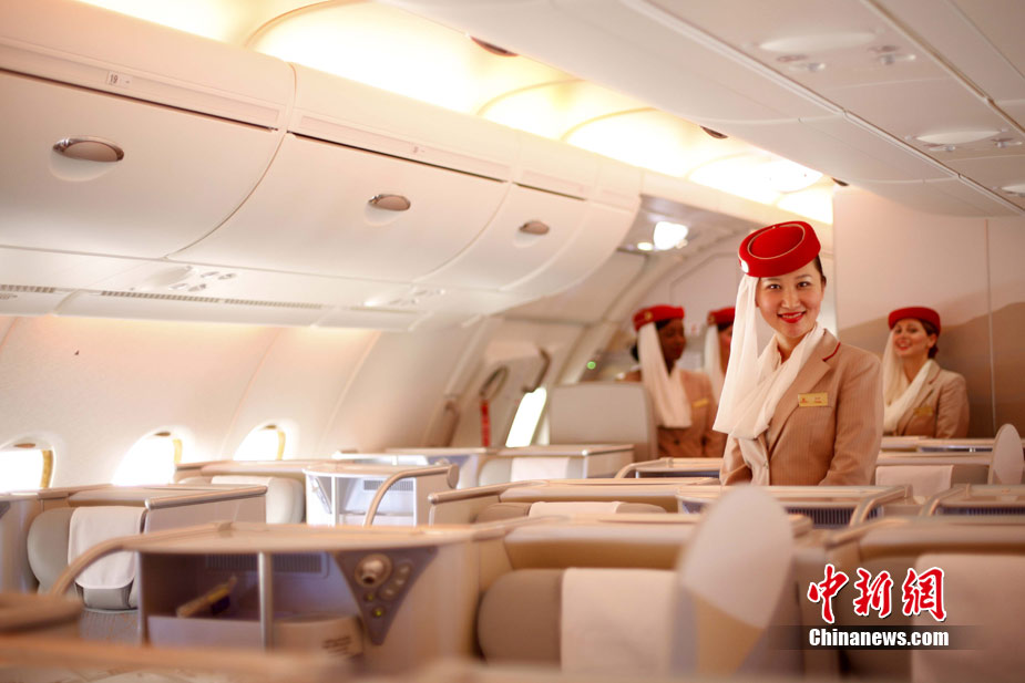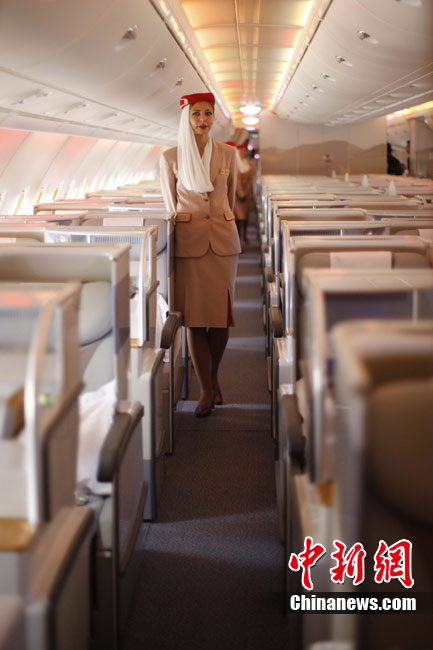 阿航A380 客機(jī)頭等艙內(nèi)共有14個(gè)私人套間,設(shè)有兩間設(shè)備齊全的淋浴房,帶按摩功能的座椅可平躺成床。頭等艙和商務(wù)艙乘客還能享受如私人會(huì)所般、提供冷熱小點(diǎn)和酒品飲料的機(jī)上酒廊社交區(qū)。商務(wù)艙的座椅可放平成2米長的床,而經(jīng)濟(jì)艙的座椅可以傾斜多達(dá)33英寸,讓乘客自由舒展身體。所有艙位的乘客都可以享用阿航多達(dá)1200個(gè)頻道的數(shù)碼寬屏機(jī)上娛樂系統(tǒng),該系統(tǒng)提供空中娛樂節(jié)目。圖為阿聯(lián)酋航空空客A380上的空姐。中新社記者 盛佳鵬 攝