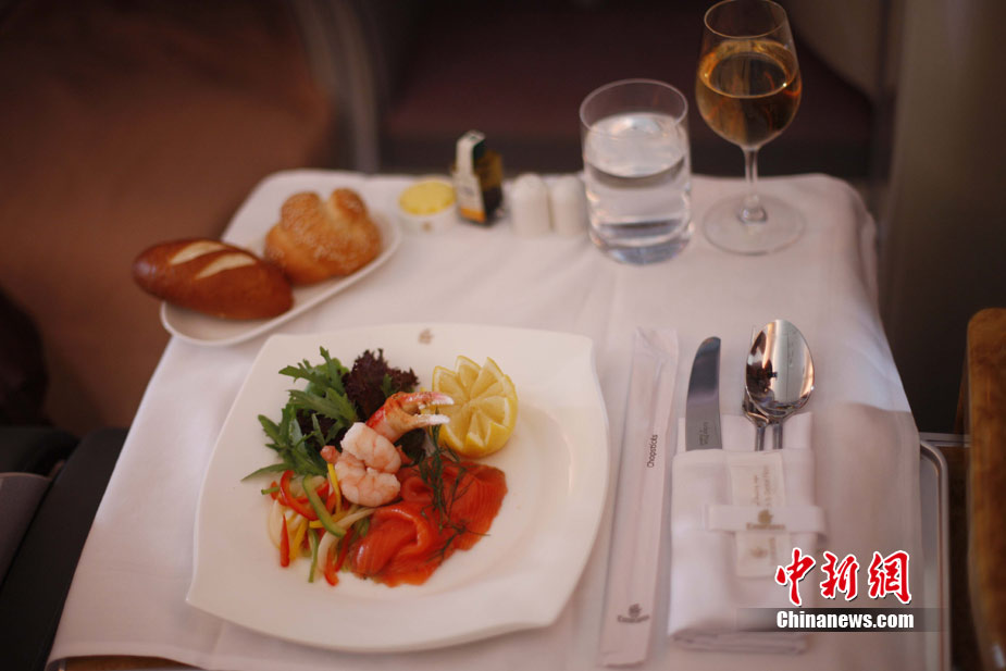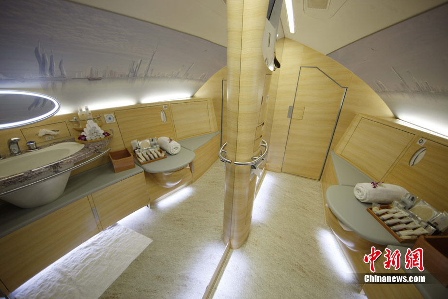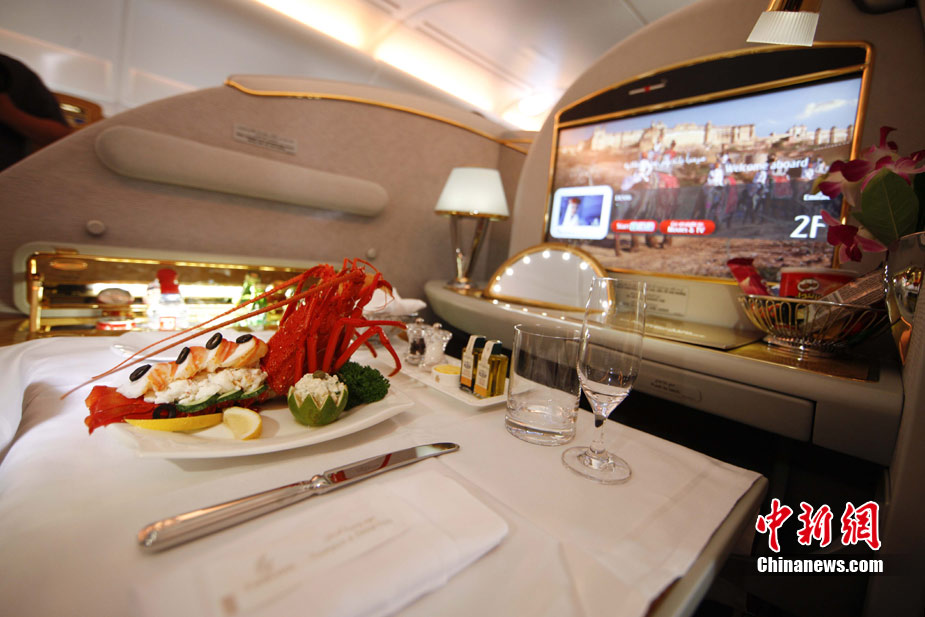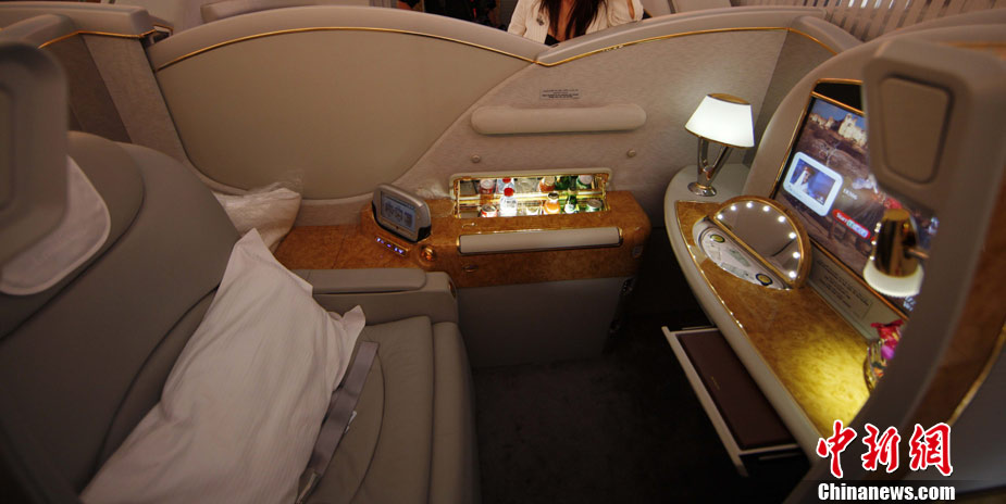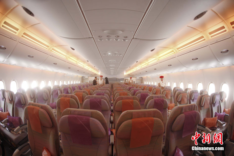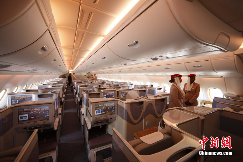 阿航A380 客機(jī)頭等艙內(nèi)共有14個(gè)私人套間,設(shè)有兩間設(shè)備齊全的淋浴房,帶按摩功能的座椅可平躺成床。頭等艙和商務(wù)艙乘客還能享受如私人會(huì)所般、提供冷熱小點(diǎn)和酒品飲料的機(jī)上酒廊社交區(qū)。商務(wù)艙的座椅可放平成2米長的床,而經(jīng)濟(jì)艙的座椅可以傾斜多達(dá)33英寸,讓乘客自由舒展身體。所有艙位的乘客都可以享用阿航多達(dá)1200個(gè)頻道的數(shù)碼寬屏機(jī)上娛樂系統(tǒng),該系統(tǒng)提供空中娛樂節(jié)目。圖為阿聯(lián)酋航空空客A380上的空姐。中新社記者 盛佳鵬 攝