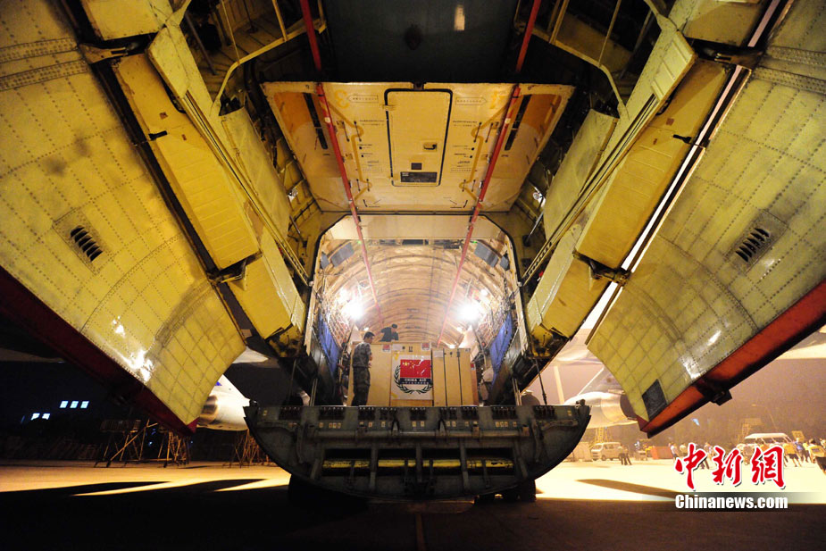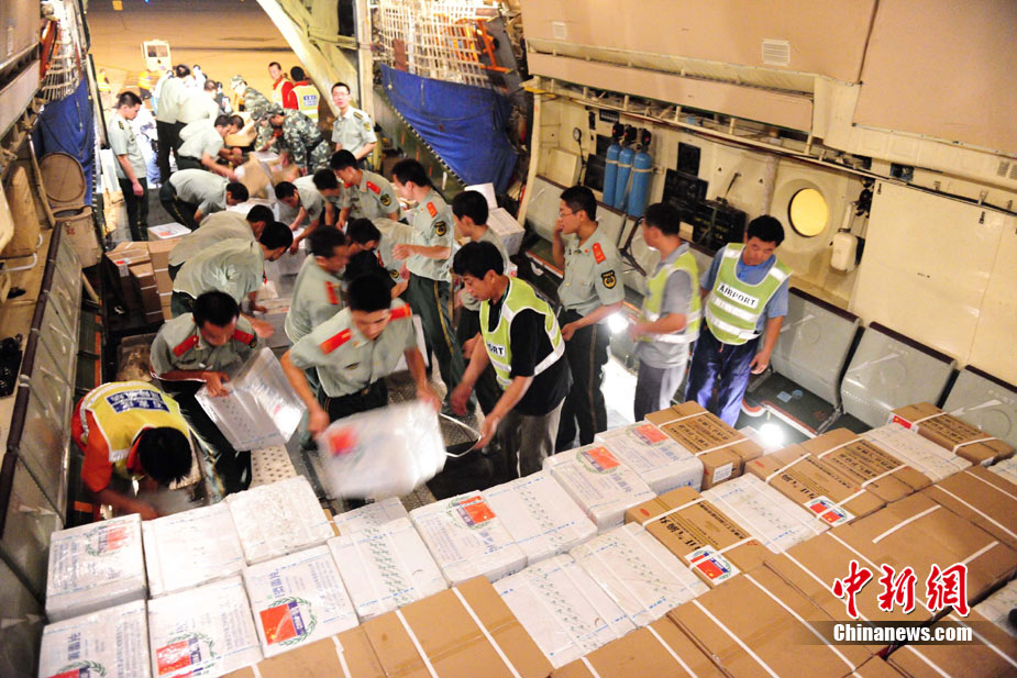 8月3日深夜,中國政府緊急援助巴基斯坦人道主義物資在河北省石家莊機(jī)場連夜裝機(jī),準(zhǔn)備于4日通過中國空軍飛機(jī)運(yùn)往伊斯蘭堡。這批物資包括30噸藥品和凈水設(shè)備、1000頂帳篷、50臺(tái)發(fā)電機(jī)等,總價(jià)值約1000萬元人民幣。 中新社發(fā) 侯宇 攝