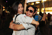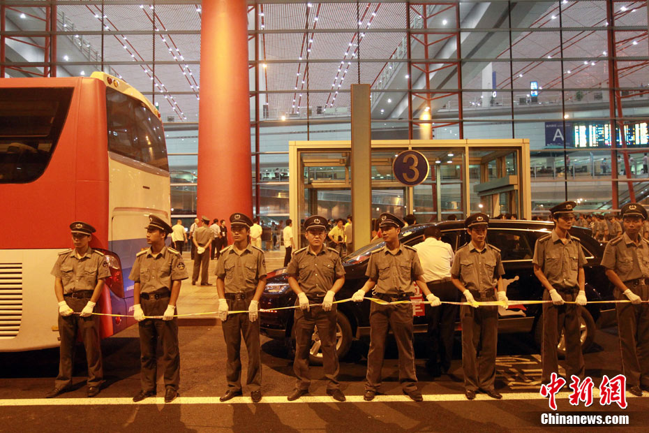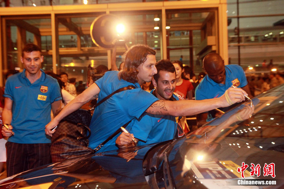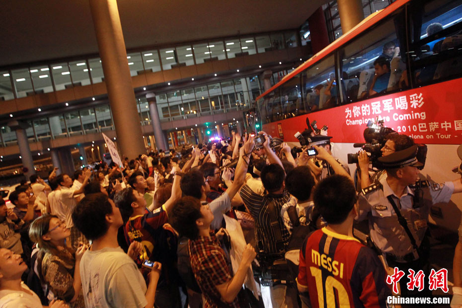 8月5日凌晨,巴薩全隊(duì)乘機(jī)從首爾飛抵北京,在首都國(guó)際機(jī)場(chǎng)的T3航站樓,西甲冠軍受到了數(shù)百名中國(guó)球迷的熱烈歡迎。梅西和伊布的到來(lái),讓深夜的首都機(jī)場(chǎng)處于一片沸騰之中。圖為梅西艱難突出重圍。 中新社發(fā) 杜洋 攝