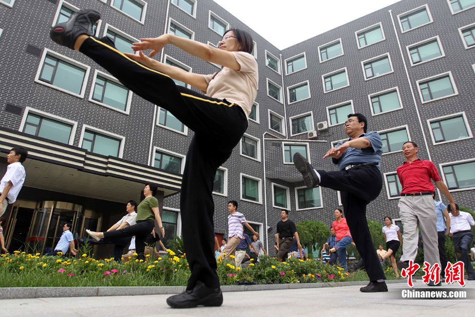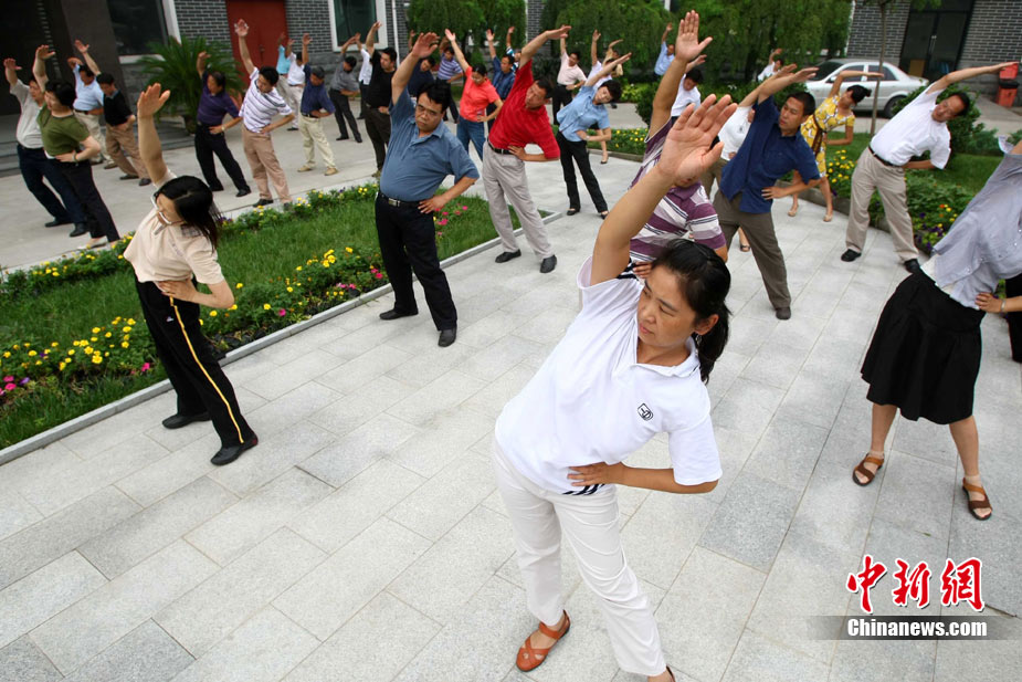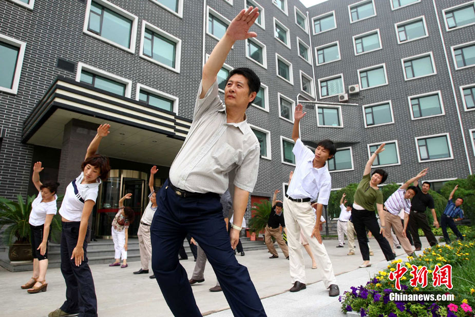 8月9日,北京化工集團的職工在工間時段集體做廣播體操。當日,北京恢復廣播體操,電臺在每天10時和15時連續(xù)播放兩次第八套廣播體操音樂,時長為8分鐘左右。此次,北京市總工會定下目標,2011年全市職工參與健身活動比例要達到60%以上,國有企業(yè)參與工間或工前操活動要達到100%,機關(guān)事業(yè)單位要達到70%。中新社發(fā) 富田 攝