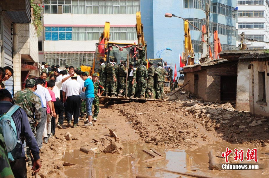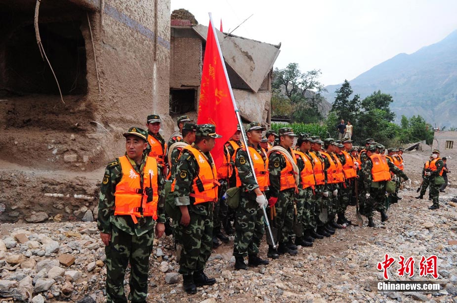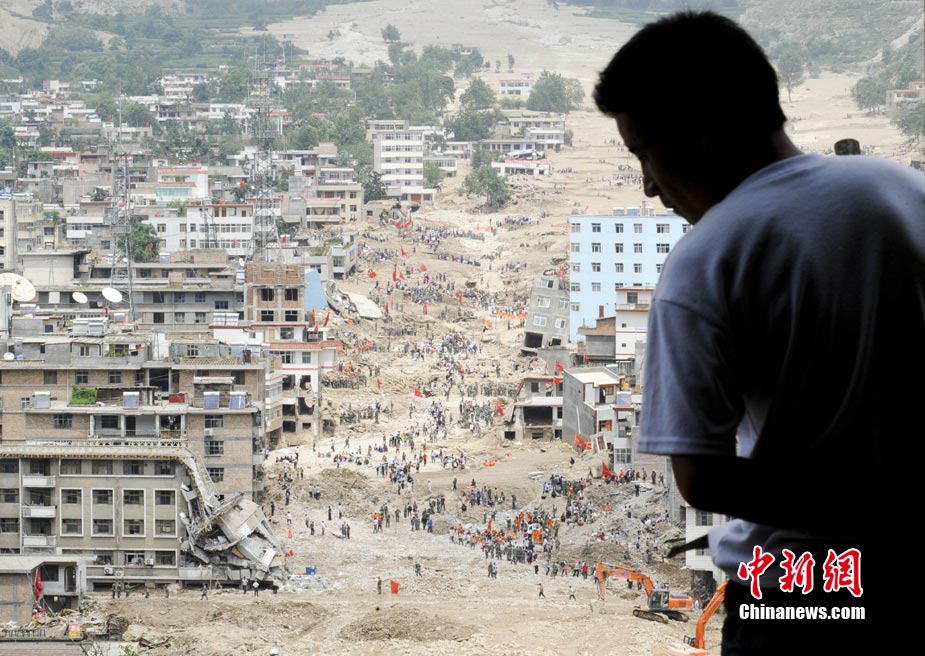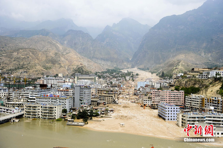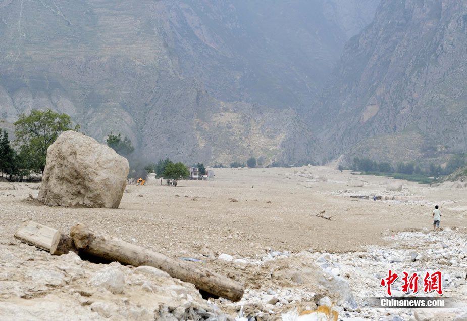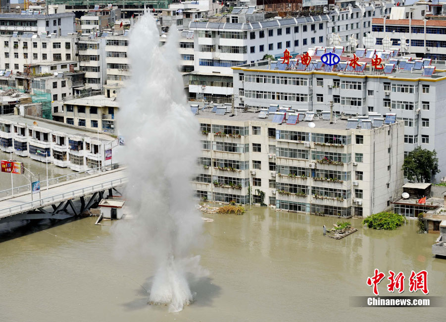 8月10日,甘肅舟曲泥石流災(zāi)區(qū),蘭州軍區(qū)開(kāi)山斧工兵團(tuán)在泥石流造成的白龍江堰塞湖壩體上實(shí)施爆破。中新社發(fā) 廖攀 攝