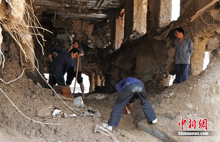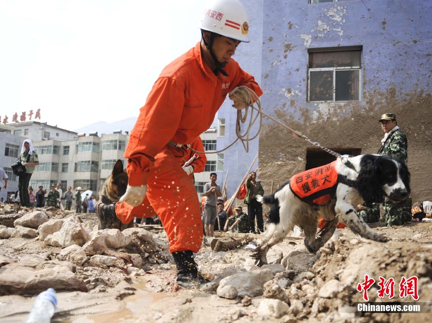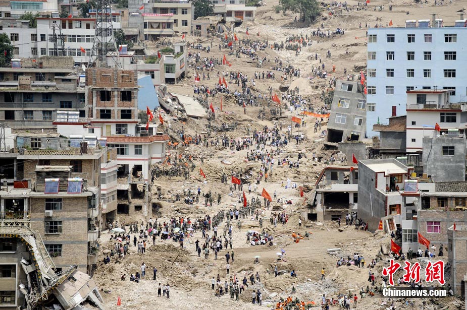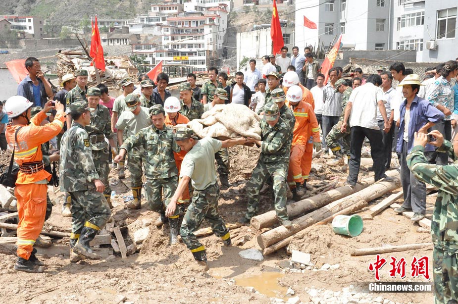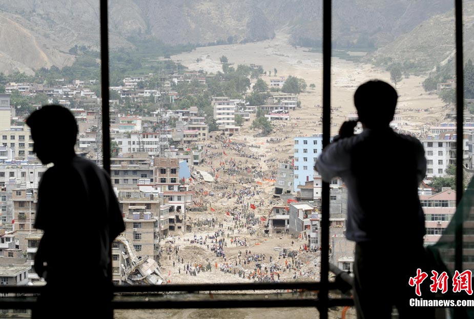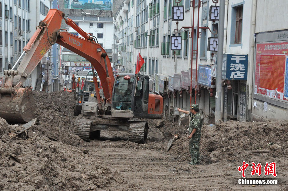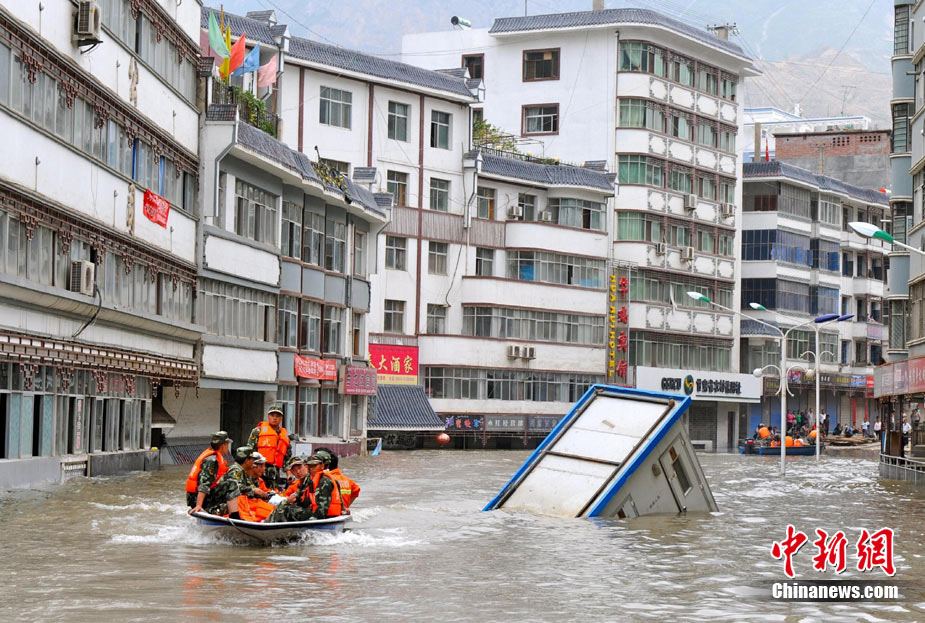 8月10日,甘肅舟曲泥石流災(zāi)區(qū),蘭州軍區(qū)開(kāi)山斧工兵團(tuán)在泥石流造成的白龍江堰塞湖壩體上實(shí)施爆破。中新社發(fā) 廖攀 攝
