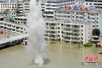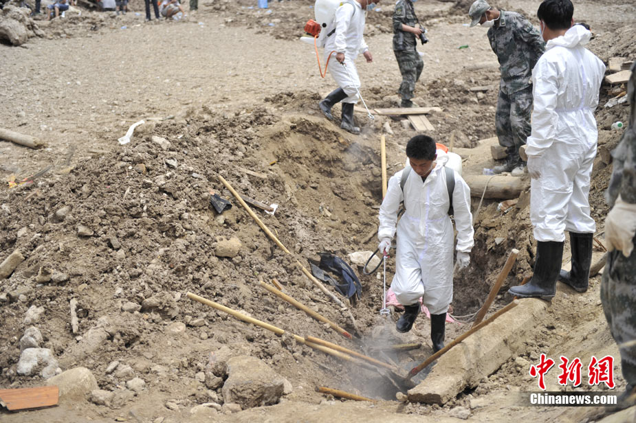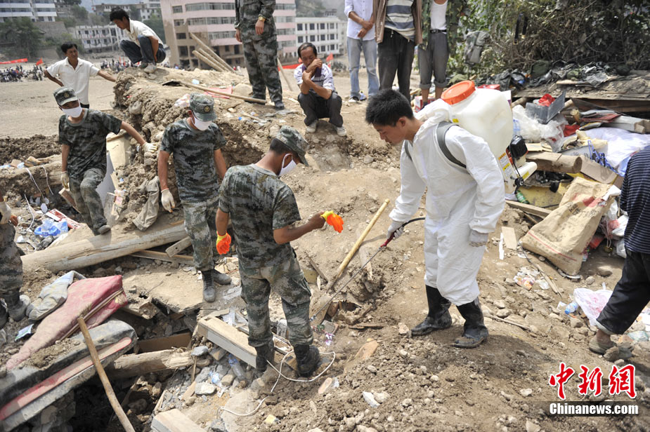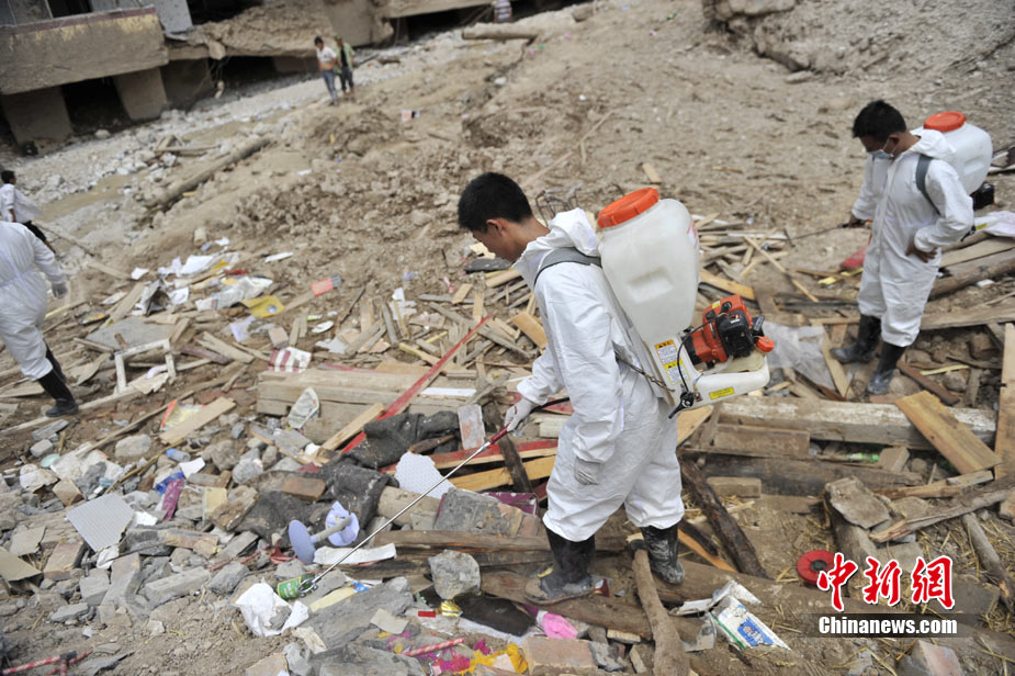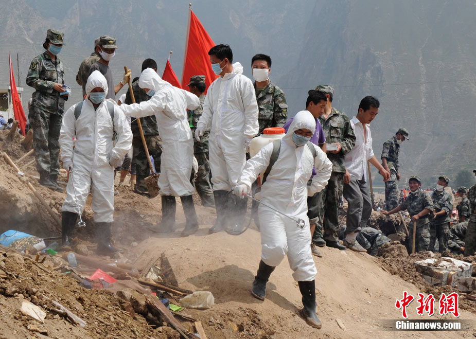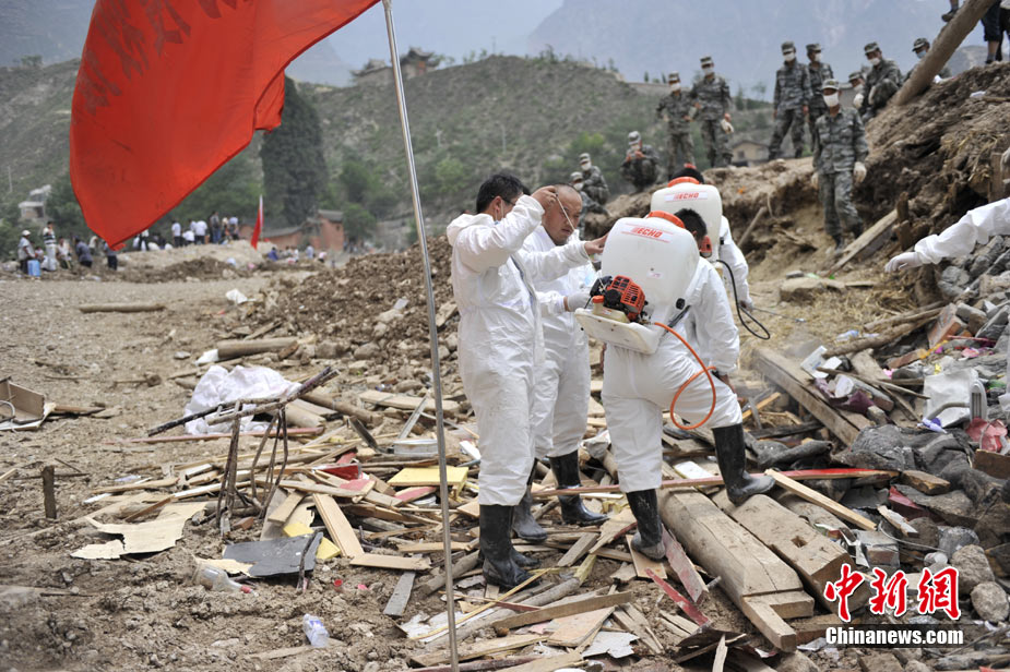 8月10日,甘肅舟曲泥石流災(zāi)區(qū)氣溫超過(guò)35攝氏度,醫(yī)療隊(duì)人員在救援現(xiàn)場(chǎng)噴灑消毒劑進(jìn)行防疫消毒。中新網(wǎng)記者 金碩 攝