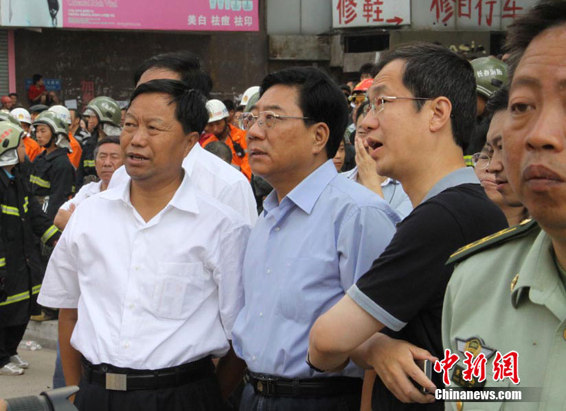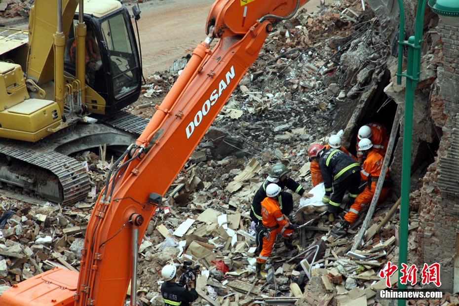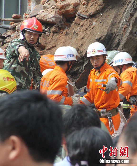 中新網(wǎng)長春8月12日電 (崔顏鋒 張?zhí)旎ⅲ?2日5時30分左右,位于長春市長春大街和大經(jīng)路交匯處的一棟老樓突然倒塌,目前已知有4人被埋在瓦礫中。截至上午10時50分,已有一人獲救,還有一人被發(fā)現(xiàn),但據(jù)稱已經(jīng)死亡。目前,救援人員正在繼續(xù)進行搜救。圖為救援人員在現(xiàn)場搜救。 張策 攝