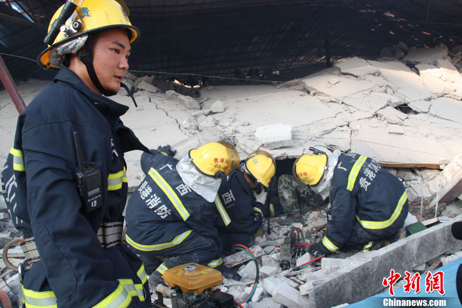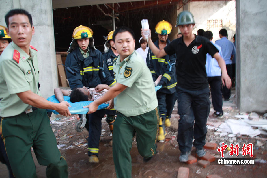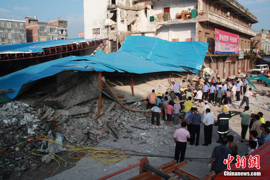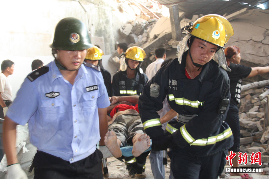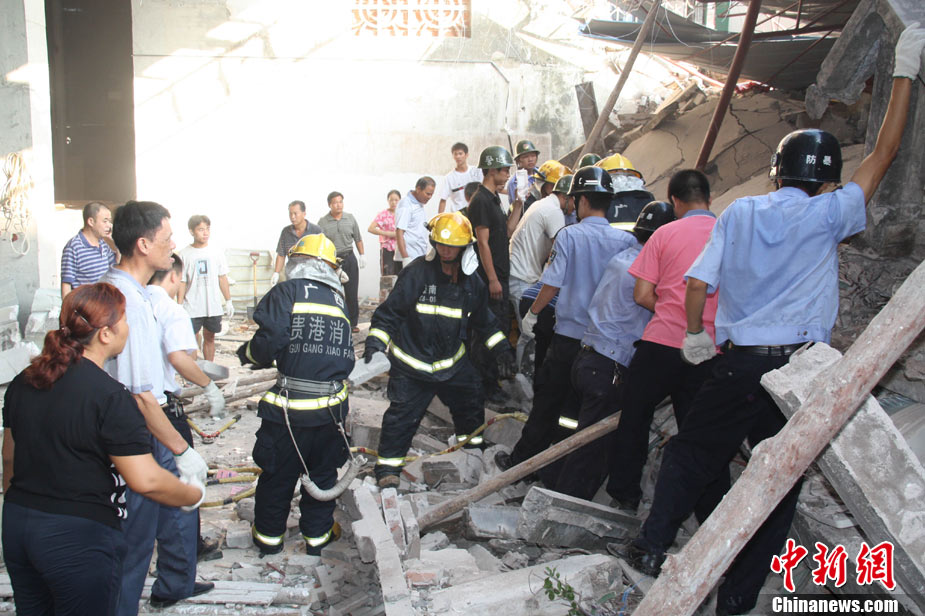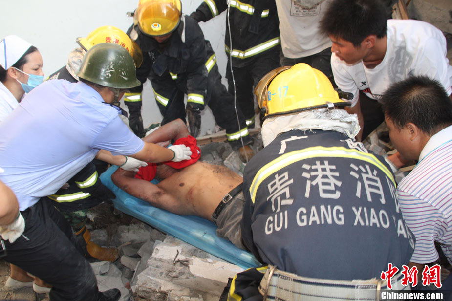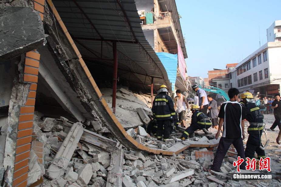 8月13日早晨,廣西貴港市橋圩鎮(zhèn)供銷(xiāo)社百貨門(mén)市部一棟3層的樓房突然倒塌,造成12名住戶(hù)被埋廢墟中。至上午10時(shí)50分,已知被埋人員被消防官兵全部救出,事故造成3人死亡9人受傷。中新社發(fā) 楊文福 攝