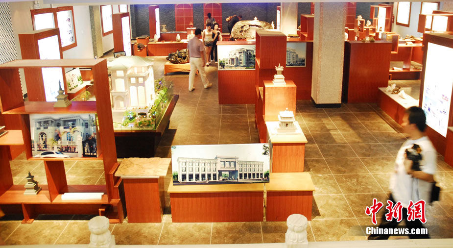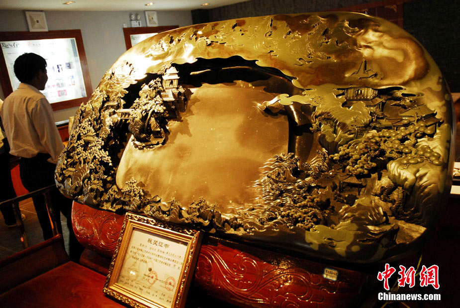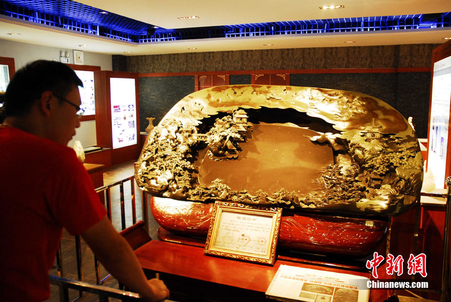 云南首個(gè)石文化體驗(yàn)館日前在石林建成并對(duì)外開放。該館是集生產(chǎn)和銷售為一體,目的在于推廣石文化,展示石頭的魅力。圖為叫價(jià)8000萬的奇石硯臺(tái)成為該館鎮(zhèn)館石。中新社發(fā) 田洪 攝
