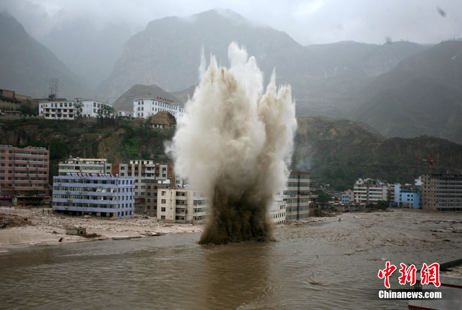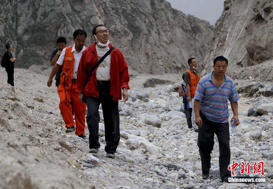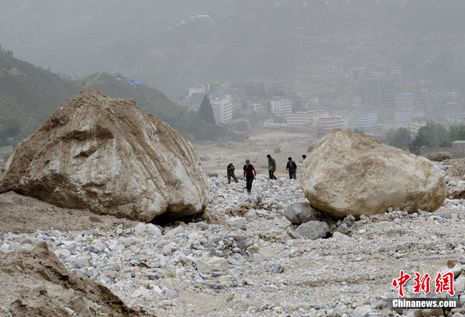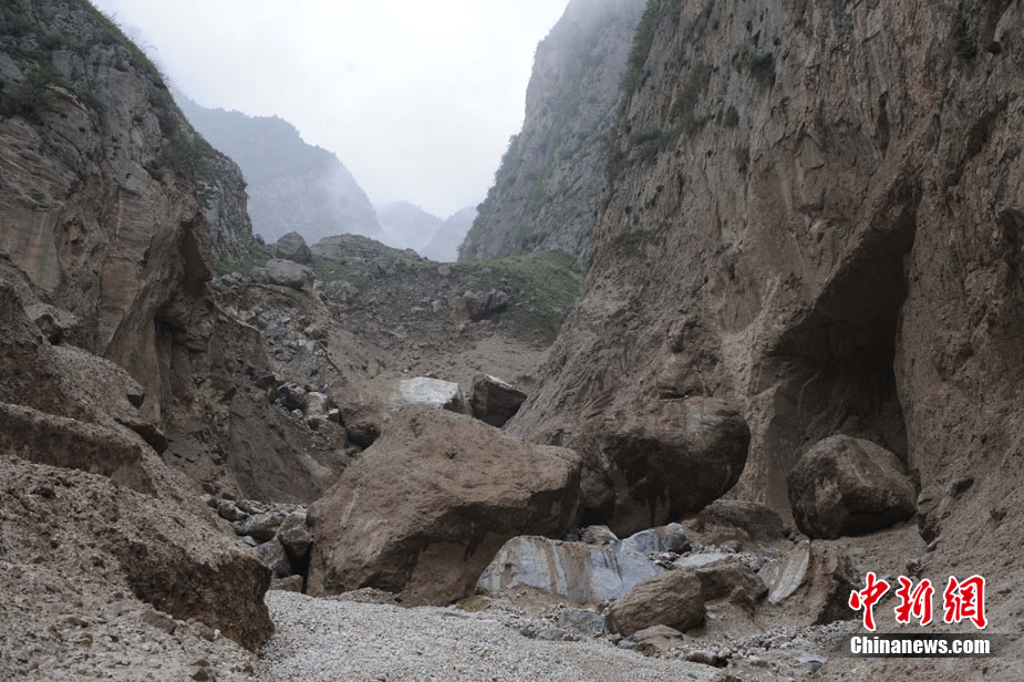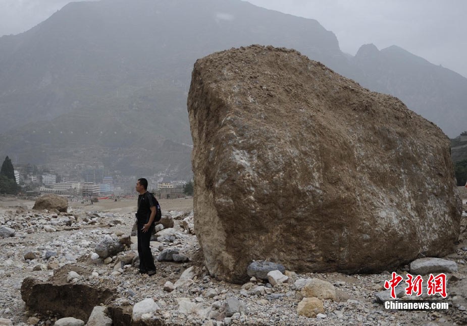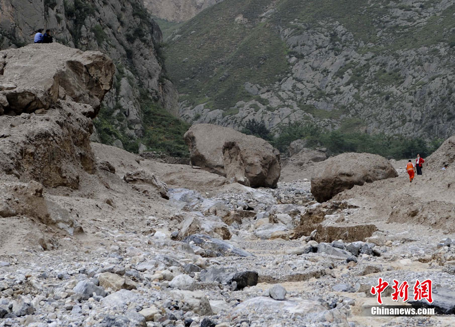8月13日,甘肅舟曲泥石流災區(qū)上源小眼峪垮下的巨大山石。在大眼峪和小眼峪有四道被稱作“谷坊壩”的四道防泥石流堤壩,在這次災害中全部被沖毀。中新社發(fā) 廖攀 攝