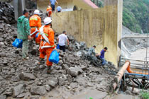 8月14日凌晨,連續(xù)強降雨引發(fā)汶川境內(nèi)映秀鎮(zhèn)、漩口鎮(zhèn)、銀杏鄉(xiāng)、三江鄉(xiāng)等鄉(xiāng)鎮(zhèn)發(fā)生多處泥石流災(zāi)害。其中銀杏鄉(xiāng)境內(nèi)泥石流塌方量高達6萬立方米,流經(jīng)該鄉(xiāng)的岷江也因泥石流阻斷,正在形成堰塞湖;映秀鎮(zhèn)板房醫(yī)院被泥石流沖毀。中新社發(fā) 薛升玉 攝