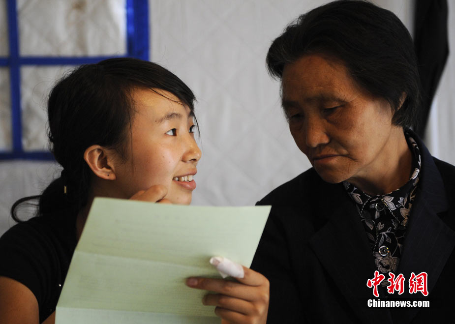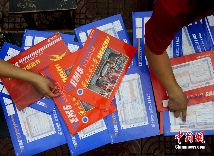 8月14日,甘肅舟曲災(zāi)區(qū)的高考錄取通知書(shū)正在發(fā)放過(guò)程中,學(xué)生們接過(guò)火紅色的錄取通知書(shū)信封,眼里有藏不住的笑意。然而,有一些通知書(shū)卻永遠(yuǎn)無(wú)法發(fā)出了。截至上午10點(diǎn)30分,舟曲一中收發(fā)室當(dāng)天共發(fā)出7份錄取通知書(shū),還有30多封正等待領(lǐng)取。中新社發(fā) 廖攀 攝