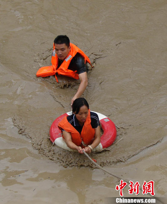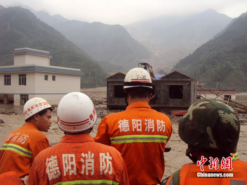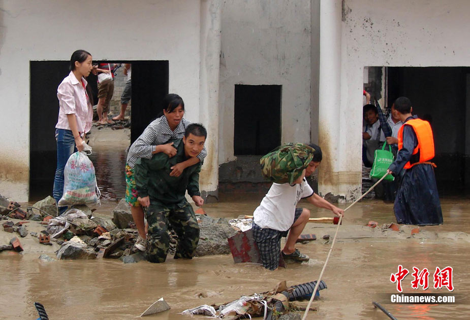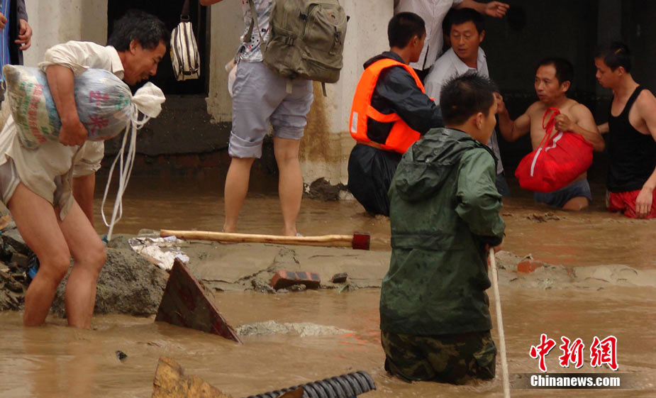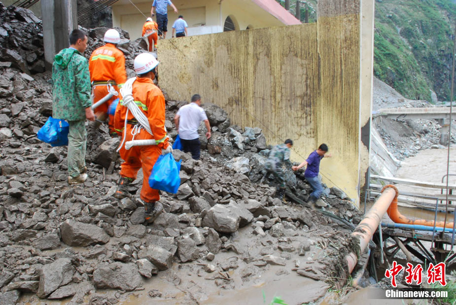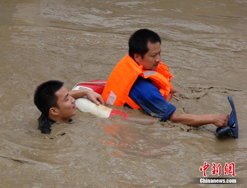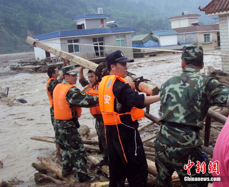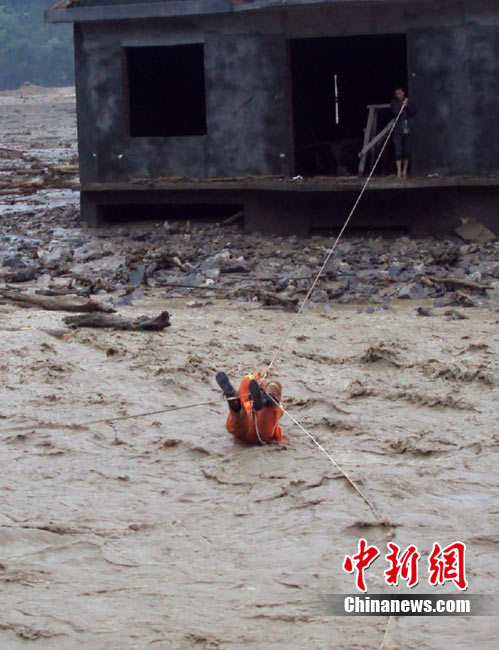 8月14日,四川德陽綿竹市清平、天池等山區(qū)遭遇暴雨泥石流襲擊,災害發(fā)生后,德陽消防出動車輛20臺次,消防官兵123人次,從各類災害事故中營救被困群眾26人,疏散群眾18人。圖為公安、消防、武警聯(lián)手營救被困村民。中新社發(fā) 沈消軒 攝