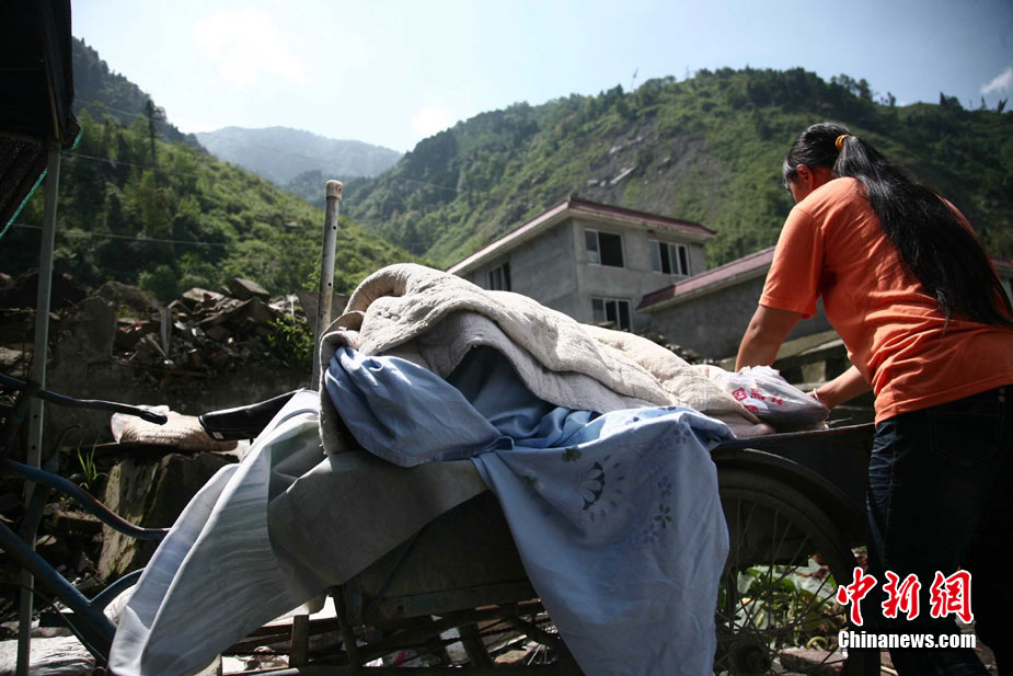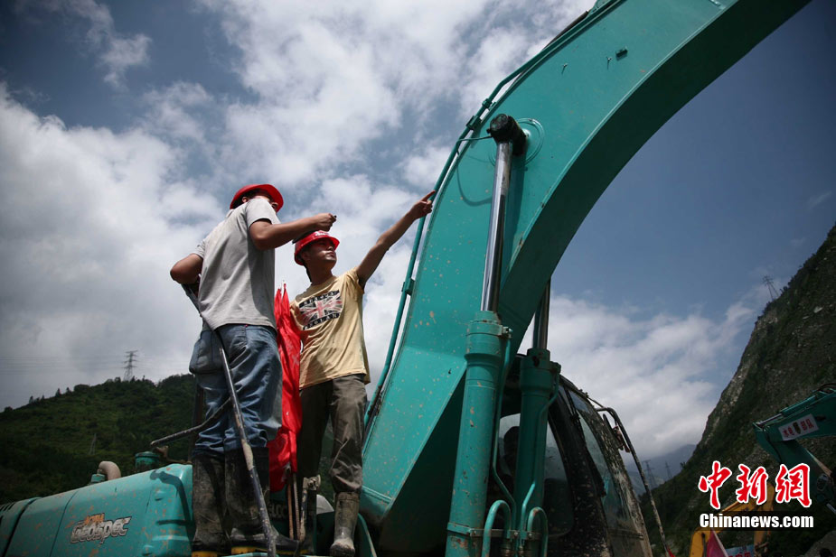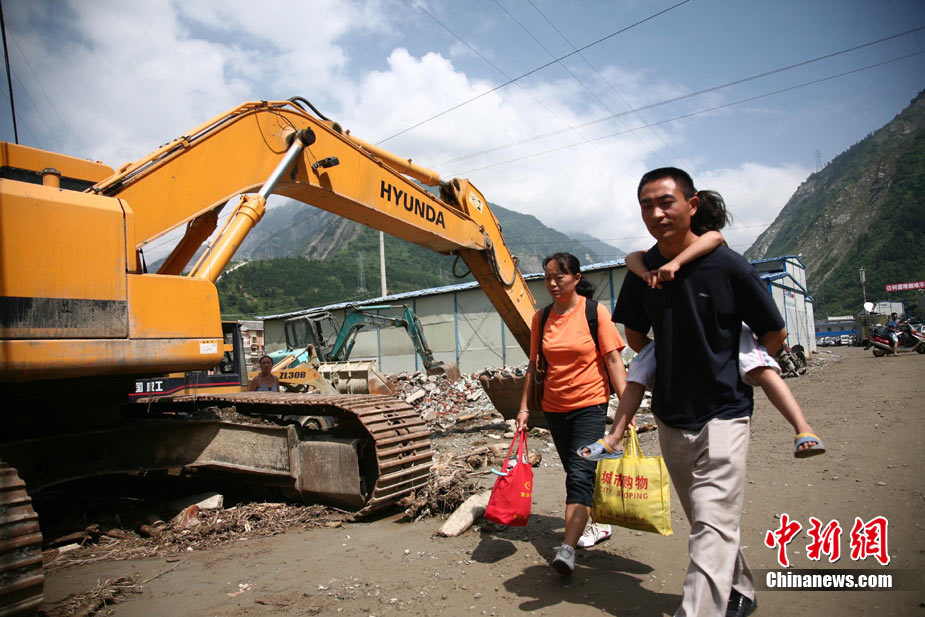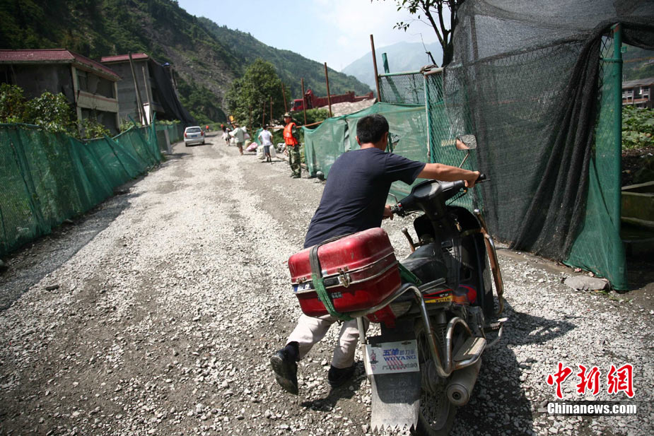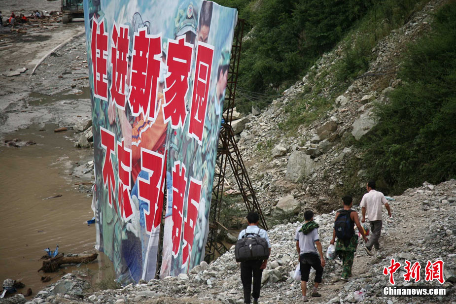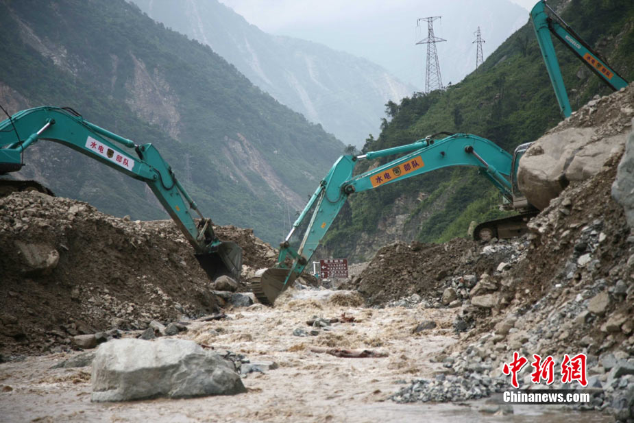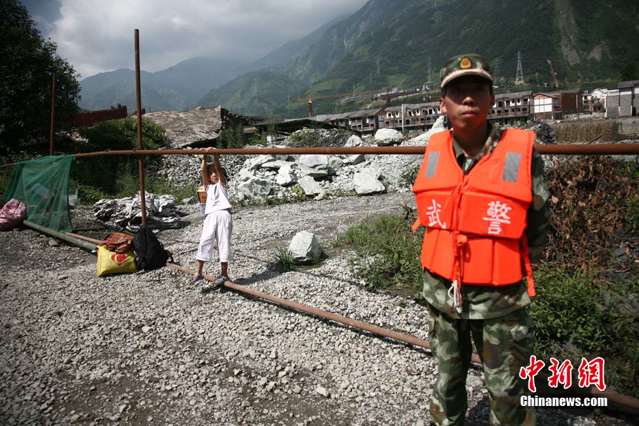 阿壩州汶川境內(nèi)因近日強降雨而引發(fā)的泥石流阻斷道路、沖毀房屋,泥石流沖出物致使120米寬的岷江河道淤塞,堰塞體平均高度達(dá)7米,致使岷江改道。災(zāi)后重建的映秀新城亦被洪水圍困再次成為“孤島”。8月15日,映秀天空放晴,但堰塞體還未得到根本疏通,映秀新城仍被淹水中,現(xiàn)場搶險指揮人員表示,堰塞體有望15日下午得到疏通。圖為映秀鎮(zhèn)岷江河床上一朵快枯萎的向日葵,背后則是被水淹的重建新房。 中新社發(fā) 張浪 攝