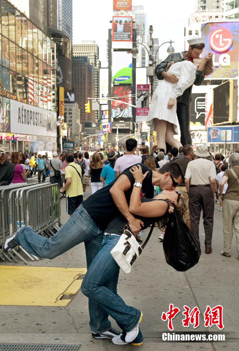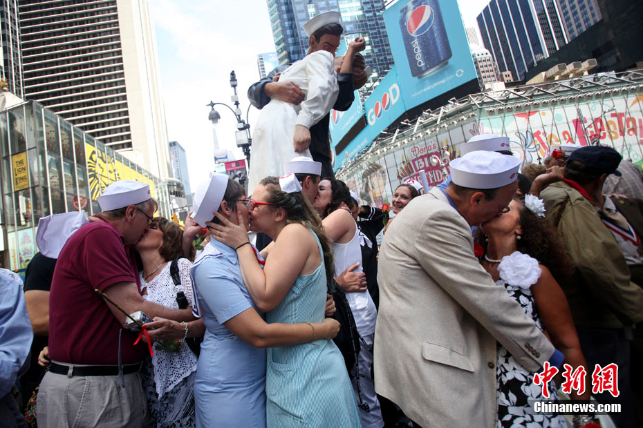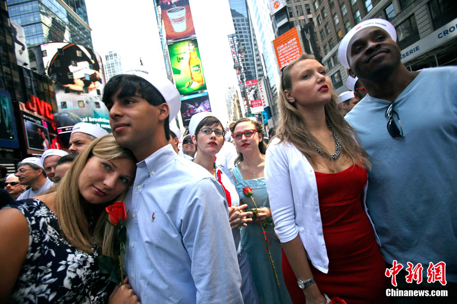 來(lái)自不同國(guó)家、不同種族的200多對(duì)情侶,14日齊聚紐約時(shí)報(bào)廣場(chǎng),再現(xiàn)“勝利日之吻”的經(jīng)典瞬間,以此紀(jì)念二戰(zhàn)結(jié)束65周年。