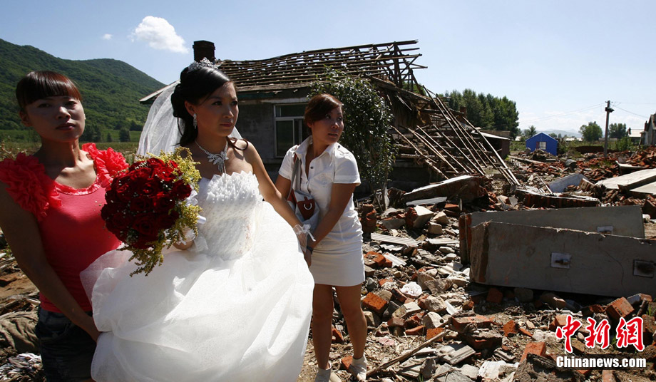 8月16日,吉林市前二道鄉(xiāng)“災(zāi)區(qū)新娘”劉旭穎在藍色的救災(zāi)帳篷里出嫁。27歲的劉旭穎本應(yīng)在7月30日結(jié)婚,然而7月28日凌晨的一場罕見洪水將她家所在的村莊變成一片廢墟,也沖走了準(zhǔn)新娘的婚禮。為了圓自己一個心愿,也為了讓災(zāi)區(qū)人看到生活的希望,劉旭穎決定辦一場特別的災(zāi)區(qū)婚禮。中新社發(fā) 蒼雁 攝