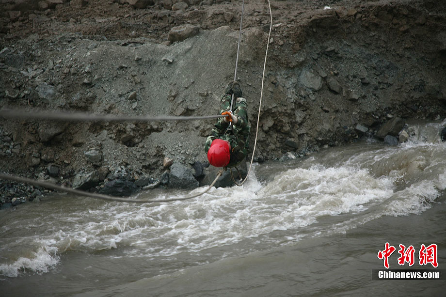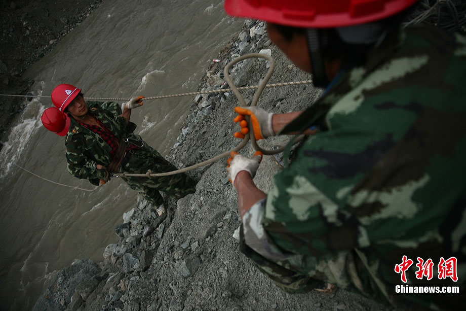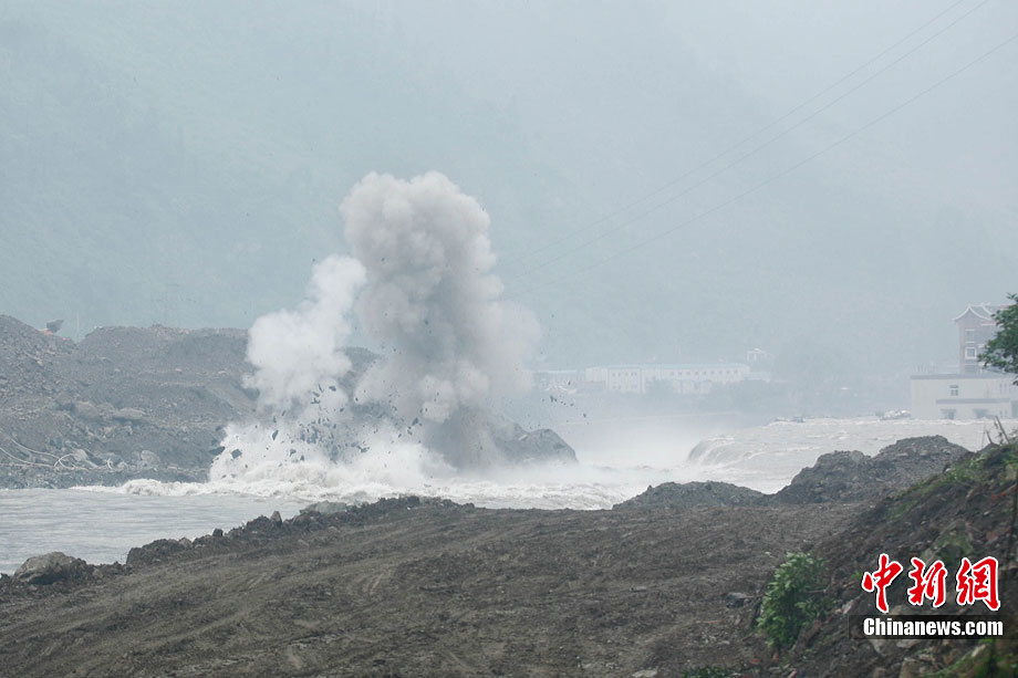 8月17日下午,映秀泥石流搶險救災(zāi)指揮部對致使岷江改道的堰塞體進行了第二次爆破,由于天氣不甚理想,為了盡快實現(xiàn)岷江河水“回軌”,救援指揮部決定以爆破的方式加快搶險進度。據(jù)爆破現(xiàn)場負責(zé)人透露,此次爆破主要是為解決8塊巨石,這些巨石超出了挖掘機的負荷量,必須選擇爆破方式解決。中新社發(fā) 張浪 攝