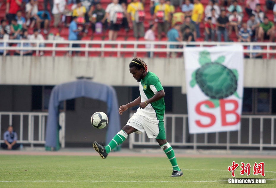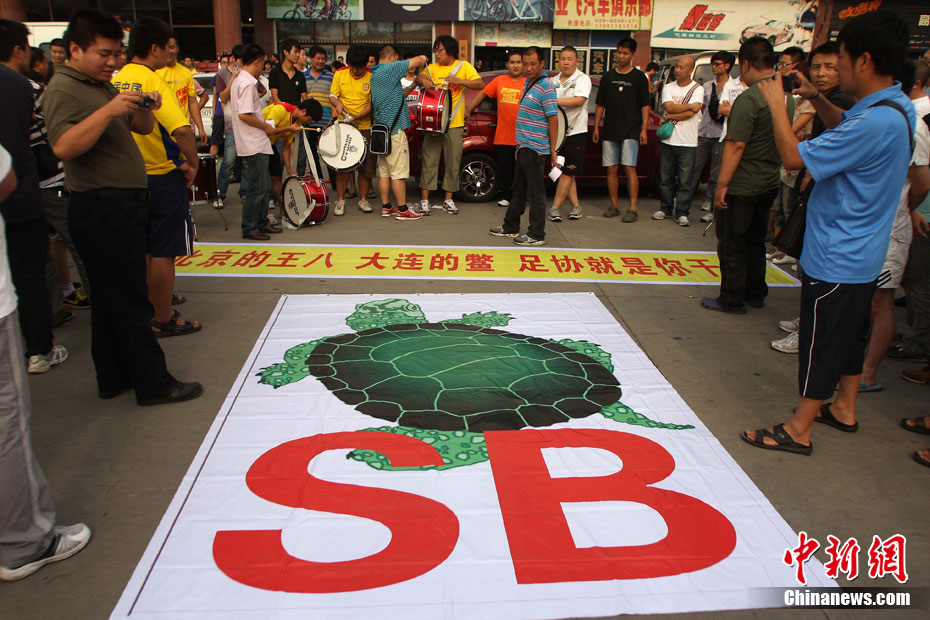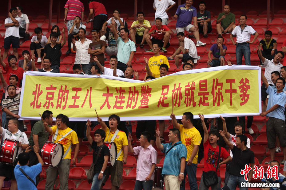 2010年8月17日,西安,北京國(guó)安隊(duì)在陜西省體育場(chǎng)備戰(zhàn)中超聯(lián)賽第19輪和陜西隊(duì)的客場(chǎng)比賽。陜西球迷“組團(tuán)”來(lái)到現(xiàn)場(chǎng),用持續(xù)不斷的罵聲干擾國(guó)安隊(duì)?wèi)?zhàn)前的踩場(chǎng)訓(xùn)練,球迷們還打出了“綠烏龜”的畫幅和各種標(biāo)語(yǔ)暗諷國(guó)安。中新社發(fā) 梁萌 攝 圖片來(lái)源:CNSPHOTO