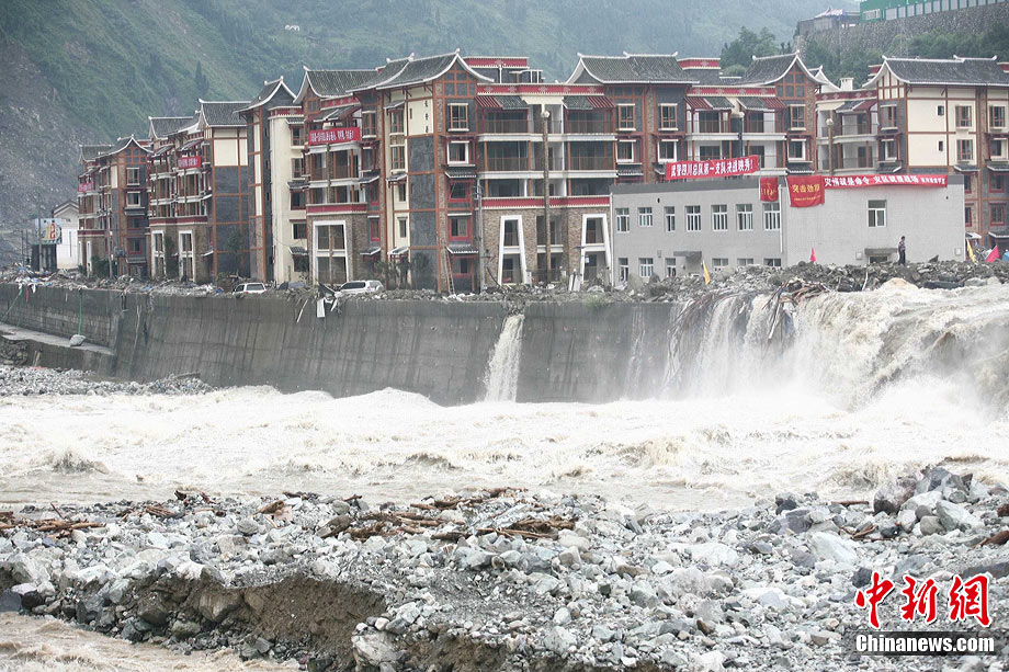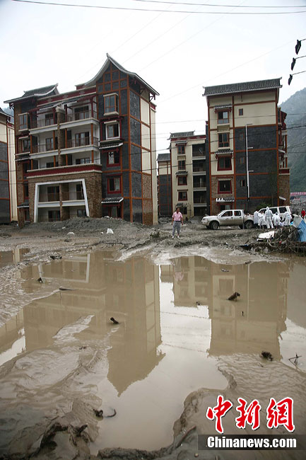 8月18日,經(jīng)過搶險(xiǎn)隊(duì)連夜奮戰(zhàn),汶川泥石流重災(zāi)區(qū)映秀鎮(zhèn)新城水位終于退去,防疫人員、清淤隊(duì)伍陸續(xù)進(jìn)入新城展開清潔工作,武警水電三總隊(duì)于當(dāng)日對(duì)堰塞體進(jìn)行第三次爆破。圖為退水后的映秀鎮(zhèn)新城。中新社發(fā) 張浪 攝
