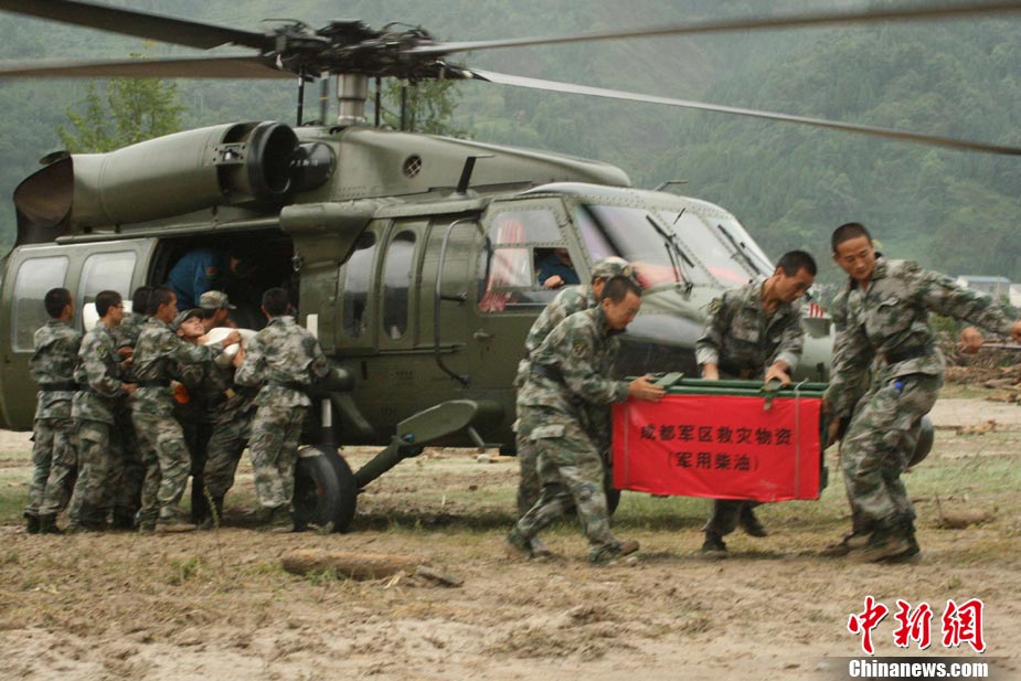 被中央軍委授予“抗震救災英雄陸航團”榮譽稱號的成都軍區(qū)某陸航團,在綿竹清平鄉(xiāng)“8.13”特大山洪泥石流災害發(fā)生后,連日來奮戰(zhàn)于災區(qū),為清平架起“生命線”,承擔起為災區(qū)運送各類救援人員,轉(zhuǎn)運災區(qū)群眾,運輸救災物資等任務。 圖為陸航團直升機為災區(qū)空運來急需的重型機械設備所需油料。中新社發(fā) 高樂暢 攝