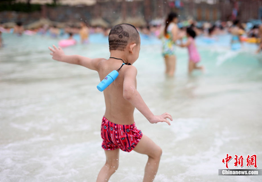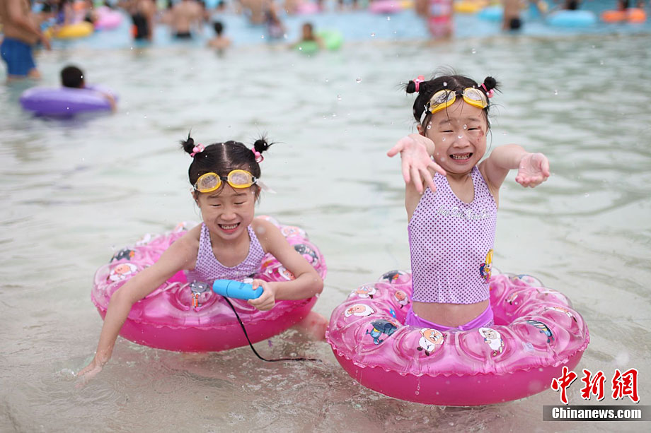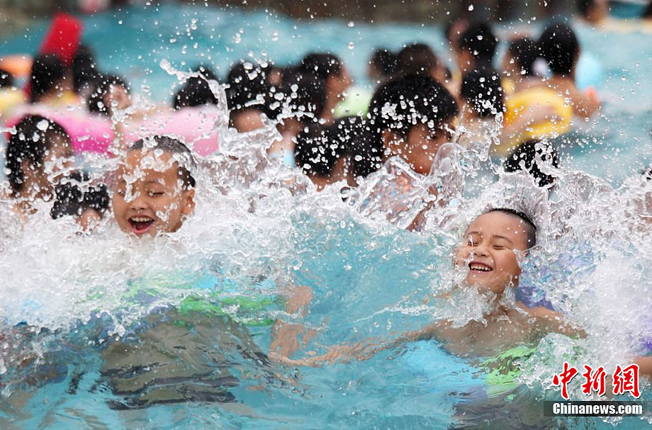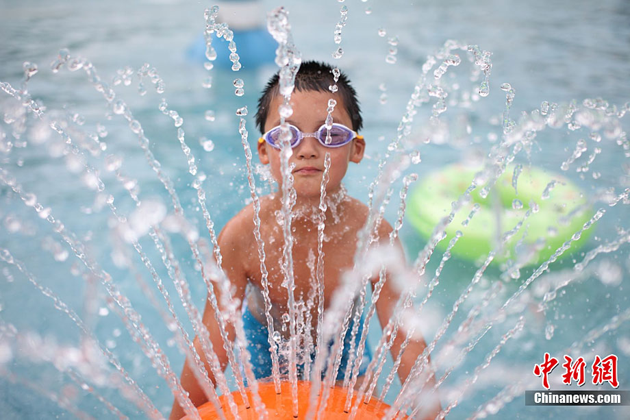 8月19日,重慶再發(fā)高溫橙色預(yù)警,預(yù)計23日以前該市將連晴高溫。為尋涼爽,一小孩趴在噴水孔附近感受水噴全身的清涼。劉函冉 攝