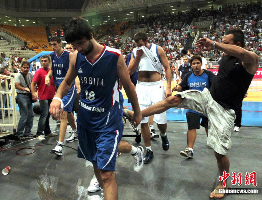 8月19日,在希臘舉行的雅典衛(wèi)城籃球四國賽中,塞爾維亞隊與希臘隊爆發(fā)沖突,裁判提前宣布比賽結(jié)束。圖為塞爾維亞隊球員克爾斯蒂奇(左)將椅子扔向希臘隊球員布魯西斯。