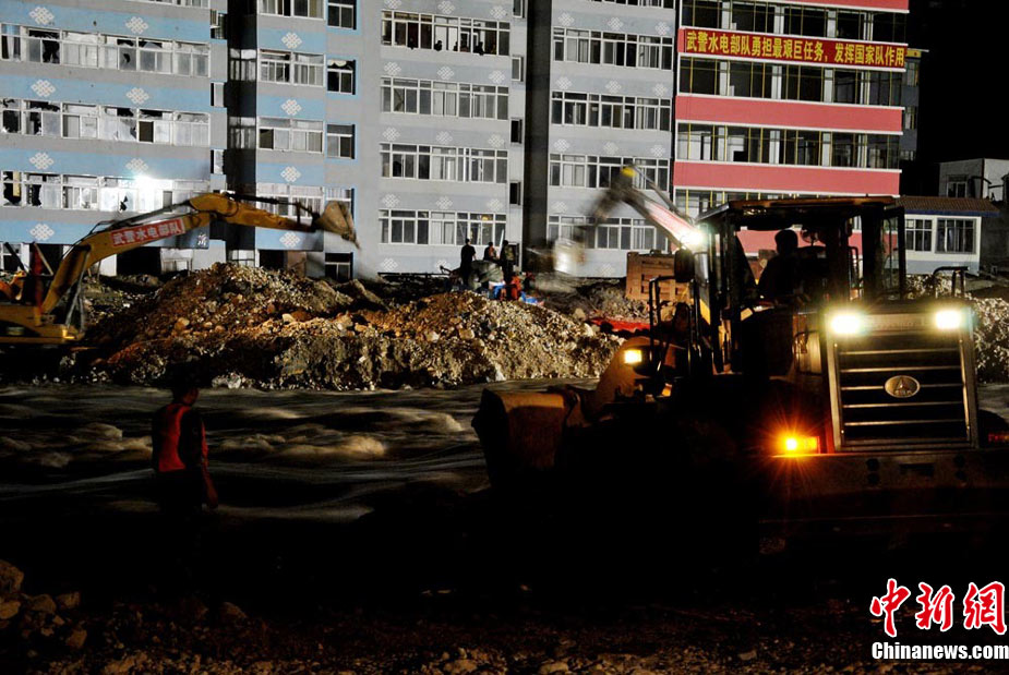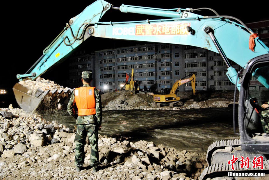 為盡快消除舟曲特大泥石流形成的白龍江堰塞體,疏通河道,早日解除舟曲縣城水患,武警水電部隊官兵日夜艱苦奮戰(zhàn)在在1.5公里的白龍江兩岸搶險一線, 24小時晝夜挖掘和清理河道中的碎石淤泥,到目前水位下降已3米多 縣城淹沒房屋逐退水面。白龍江堰塞體搶險工作已全面進入沖刺階段,圖為8月26日晚11時左右武警水電部隊官兵夜戰(zhàn)白龍江的施工現(xiàn)場。中新社記者 侯志紅 攝