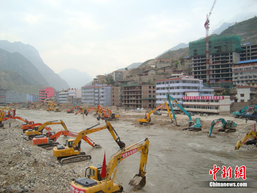 8月30日,舟曲白龍江堰塞湖應(yīng)急排險(xiǎn)和河道應(yīng)急疏通任務(wù),比預(yù)定時(shí)間提前12小時(shí)全面完成。這是解放軍副總參謀長(zhǎng)章沁生30日15時(shí)在舟曲白龍江城江橋頭召開(kāi)的新聞發(fā)布會(huì)上,向社會(huì)公布的。章沁生在發(fā)布會(huì)上說(shuō),到30日12時(shí),城江橋至城關(guān)橋段水位已回落至省道313線最低點(diǎn),城區(qū)積水全部回流歸槽,標(biāo)志著舟曲白龍江堰塞湖應(yīng)急排險(xiǎn)和河道應(yīng)急疏通任務(wù)全面完成。舟曲特大山洪泥石流災(zāi)害發(fā)生后,導(dǎo)致白龍江形成堰塞湖致使江水水位暴漲,舟曲縣城三分之一街區(qū)被淹。武警水電部隊(duì)、蘭州軍區(qū)工程兵某部每天出動(dòng)上千官兵,大型機(jī)械百余臺(tái),先是排除了堰塞湖潰決險(xiǎn)情,從13日轉(zhuǎn)入河道應(yīng)急疏通任務(wù),24小時(shí)持續(xù)奮戰(zhàn),終于提前完成了這一艱巨任務(wù)。圖為在舟曲縣城江橋上游河段,解放軍和武警部隊(duì)晝夜不停對(duì)河道進(jìn)行除險(xiǎn)清淤。 中新社發(fā) 郭海勇 攝