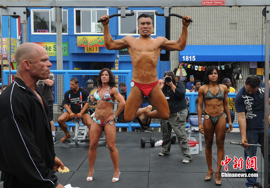 9月6日,在美國洛杉磯的威尼斯海灘,健美愛好者們參加一年一度的海灘健美錦標賽。