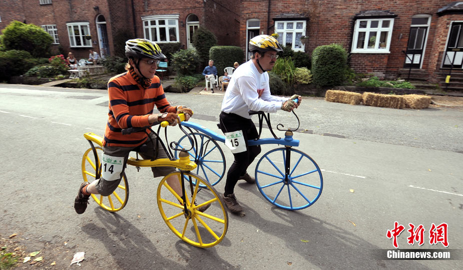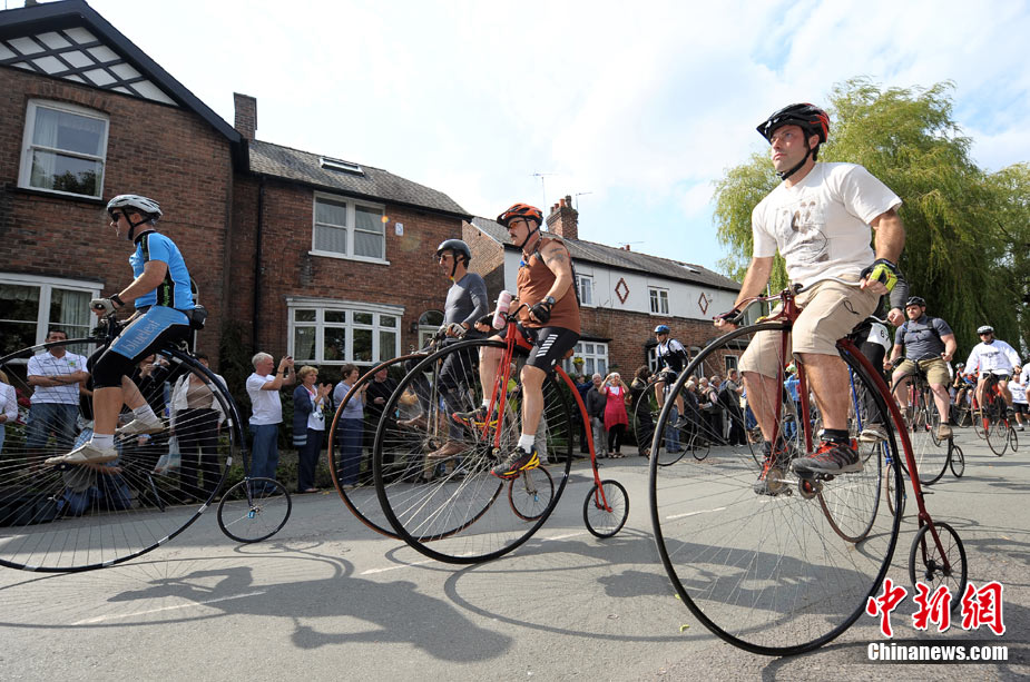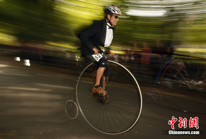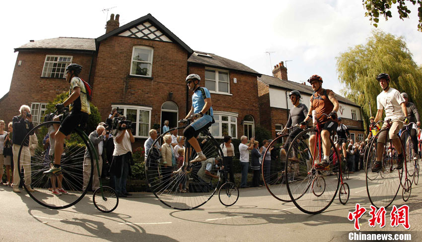 近日,英國大納茨福德舉行了復(fù)古自行車比賽。該項比賽每十年舉行一次,參賽者來自世界各地。他們須在三個小時的限時內(nèi)沿著一公里長的賽道進行騎行比賽。