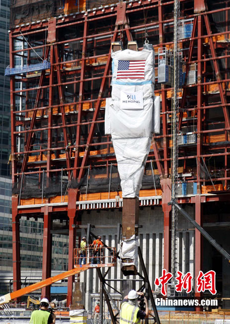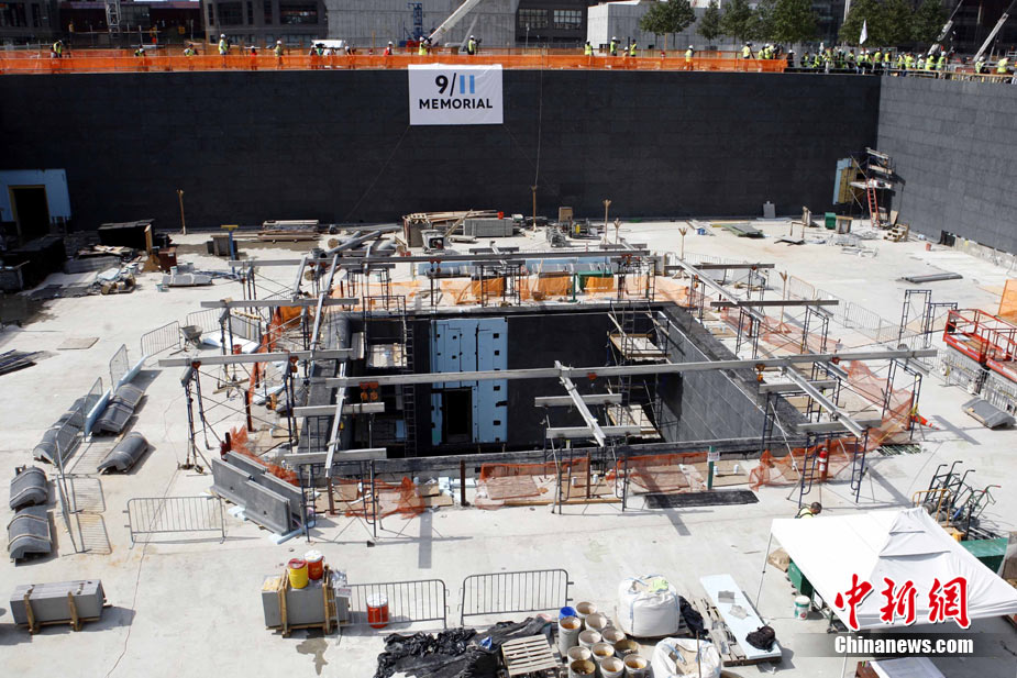 美國當(dāng)?shù)貢r間9月7日,記者在紐約世貿(mào)建筑工地現(xiàn)場看到,以原先世貿(mào)雙子塔樓基座為主體的兩個方形瀑布池業(yè)已成型,周圍也種上了些許綠樹。9·11紀(jì)念館館長喬·丹尼爾斯表示,肯定將在事件十周年紀(jì)念日當(dāng)天開館。中新社記者 孫宇挺 攝