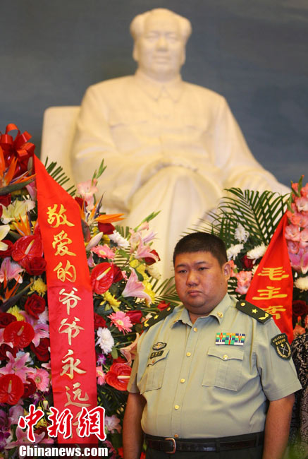 9月9日是毛澤東逝世34周年紀(jì)念日。當(dāng)日上午,毛澤東的孫子、剛剛晉升為解放軍少將的毛新宇與夫人劉濱,帶著兩歲的女兒毛甜懿到位于北京天安門廣場的毛主席紀(jì)念堂敬獻(xiàn)鮮花。中新社記者 任晨鳴 攝
