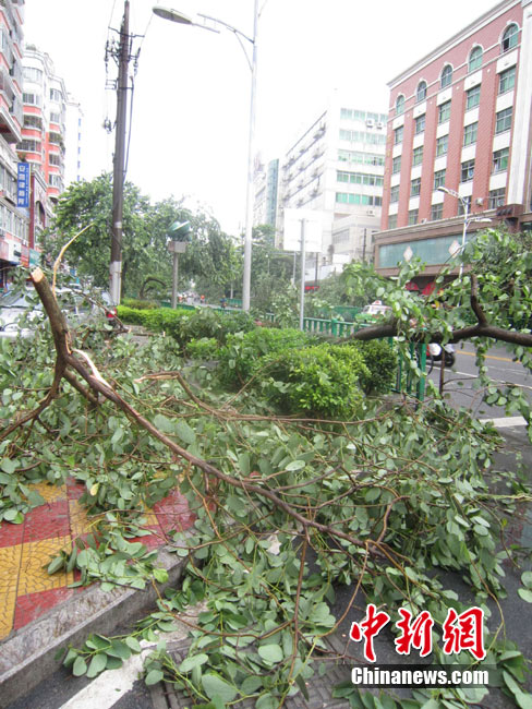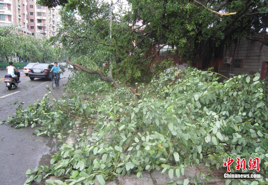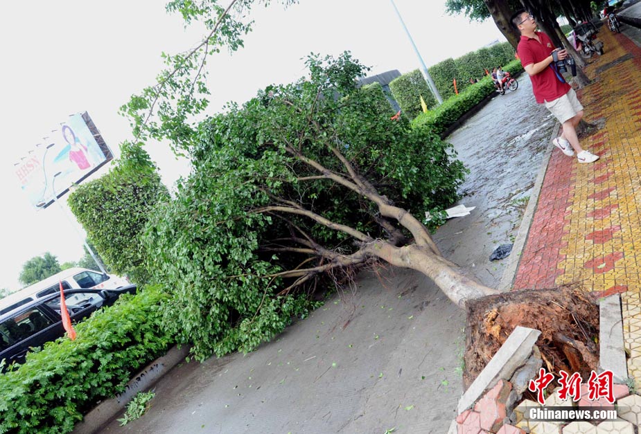 今年第10號(hào)臺(tái)風(fēng)“莫蘭蒂”10日凌晨3時(shí)30分登陸福建石獅,近中心最大風(fēng)力12級(jí)(35米/秒),給泉州帶來(lái)了狂風(fēng)暴雨。圖為9月10日上午臺(tái)風(fēng)過(guò)后、泉州市區(qū)觀音路上一棵被臺(tái)風(fēng)“莫蘭蒂”連根拔起的大樹(shù),斜倒在路邊。中新社發(fā) 孫虹 攝