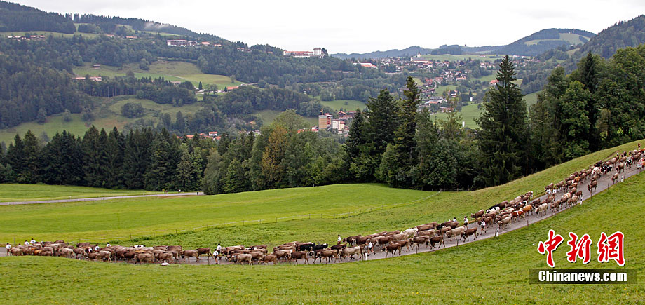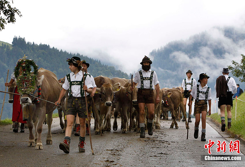 當(dāng)?shù)貢r(shí)間9月10日,德國(guó)奧博斯托芬舉行傳統(tǒng)的趕牛儀式。在山上待了一個(gè)夏天后,超過(guò)1200頭;氐缴焦,當(dāng)?shù)厝藭?huì)把一個(gè)牛頭進(jìn)行裝飾,以此紀(jì)念牛群安全歸來(lái)。