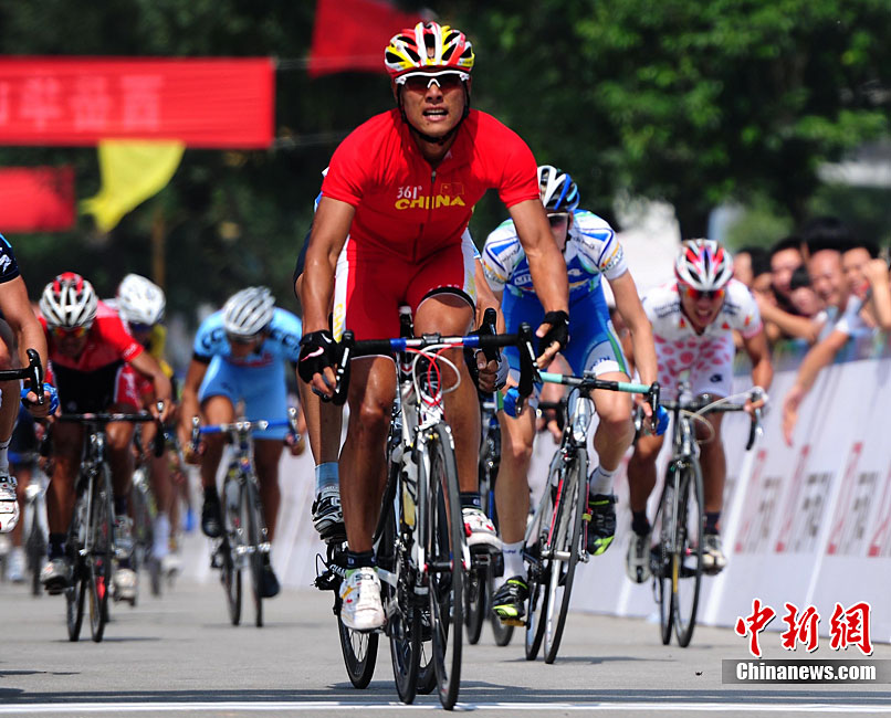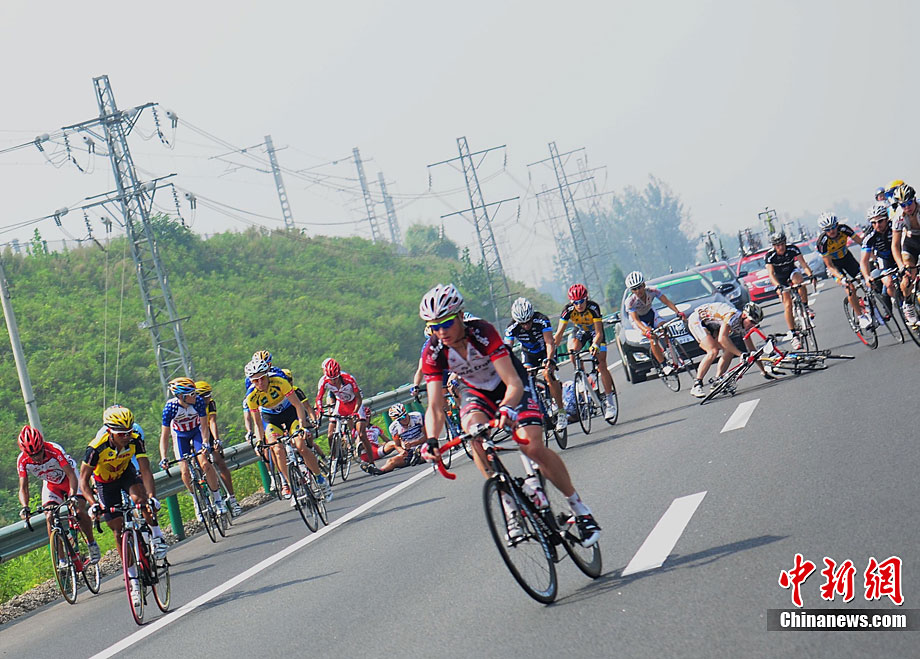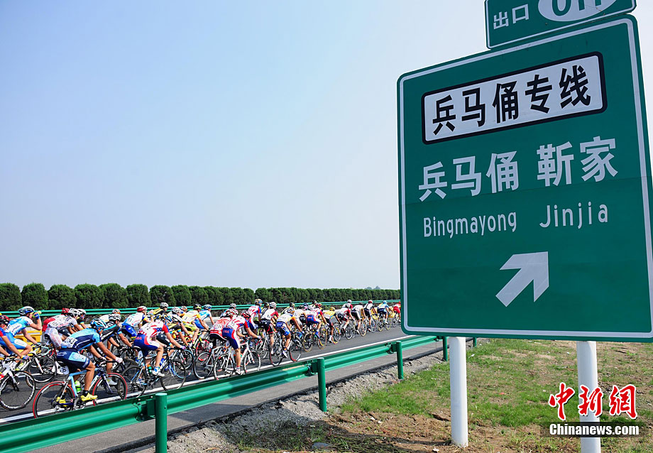 9月12日上午,首屆環(huán)中國(guó)國(guó)際公路自行車賽進(jìn)入第二賽段,由西安前往華山,全程118公里。圖為德國(guó)紐特里什車隊(duì)的一些選手們?cè)诟咚俟飞巷w速前進(jìn)。中新社記者 侯宇 攝