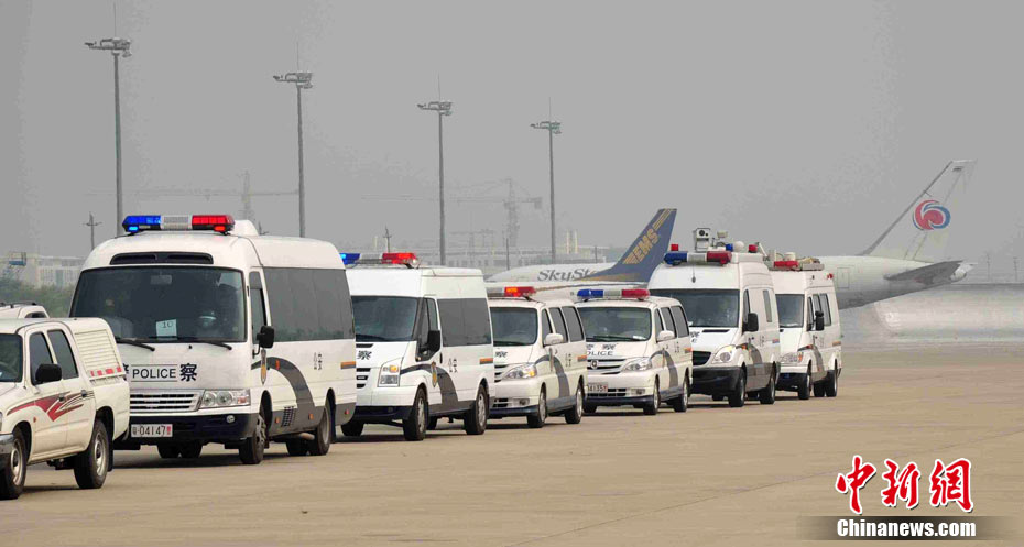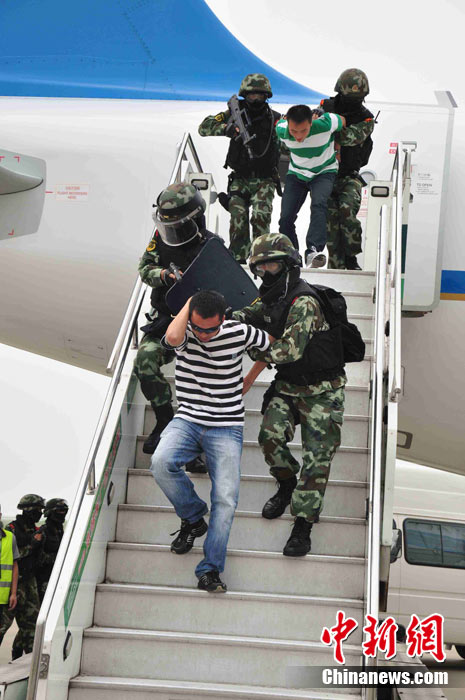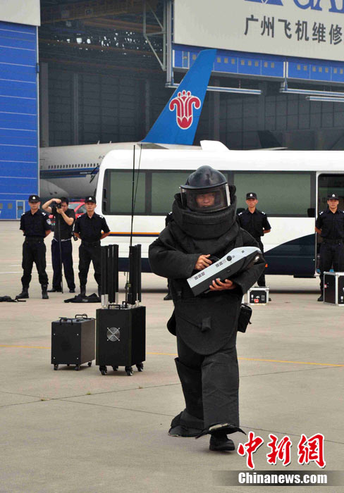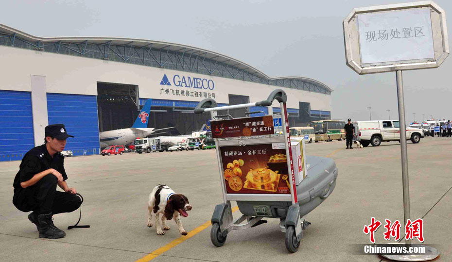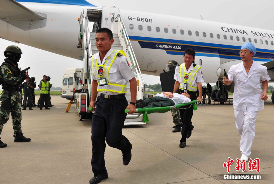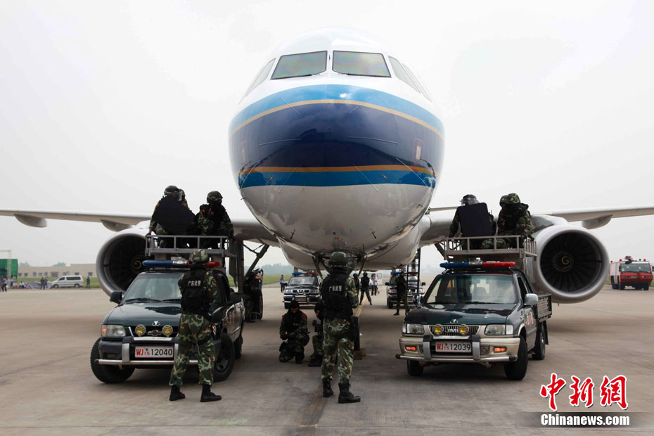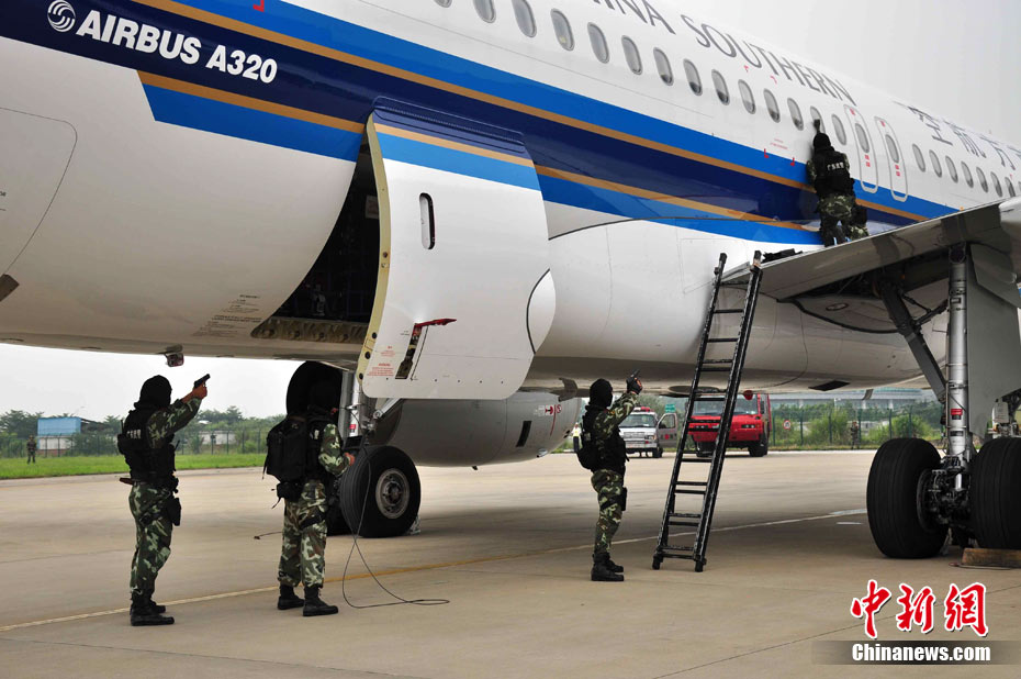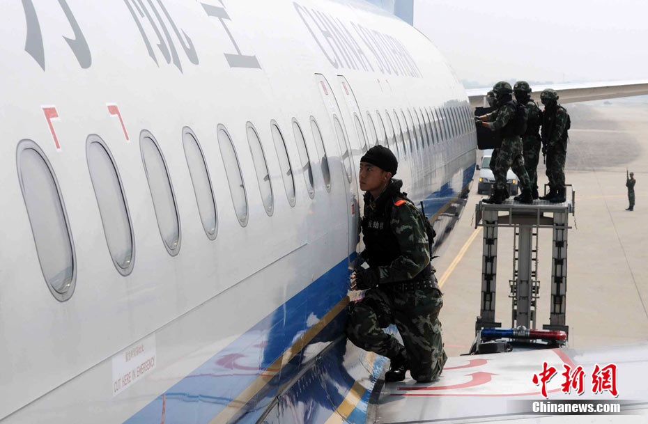 為確保平安亞運的目標,提升白云機場的反恐能力,9月12日下午,白云機場亞運安保力量重裝集結(jié),舉行大規(guī)模的反恐綜合演練。圖為反劫機特戰(zhàn)隊員控制飛機前后艙門準備突擊。中新社發(fā) 云軒 攝