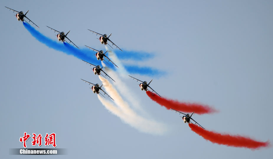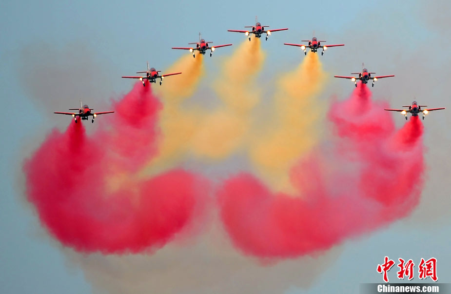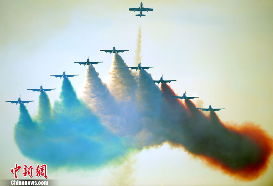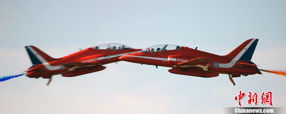 9月12日,為了慶祝意大利“三色箭”特技飛行表演隊(duì)成立50周年,多國(guó)飛行表演隊(duì)“齊聚”意大利,在Rivolto軍事基地進(jìn)行了精彩的空中特技表演。圖為英國(guó)”紅箭“飛行表演隊(duì)進(jìn)行特技表演。