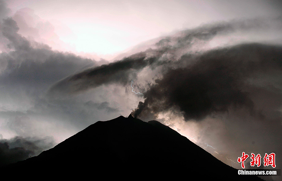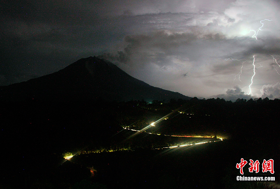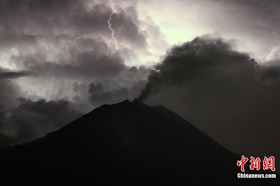 當(dāng)?shù)貢r(shí)間9月11日,印度尼西亞北蘇門(mén)答臘省丹那卡羅,閃電與錫納朋火山噴出的黑煙在空中交匯。