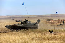 從遠處拍攝的參加“和平使命-2010”上合組織聯(lián)合反恐軍事演習(xí)的俄方參演裝備。孫彥新 攝 圖片來源:新華網(wǎng)