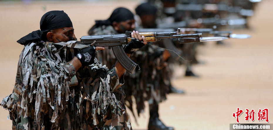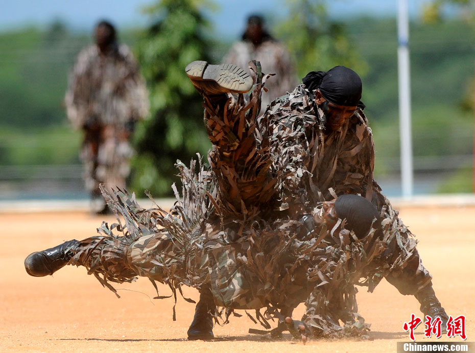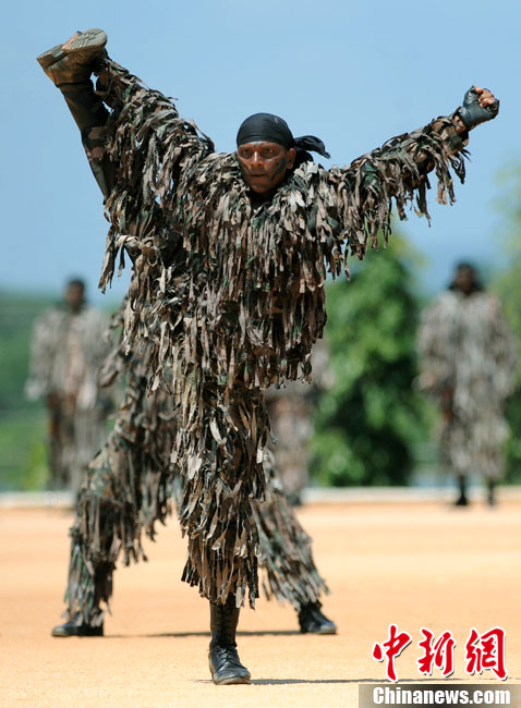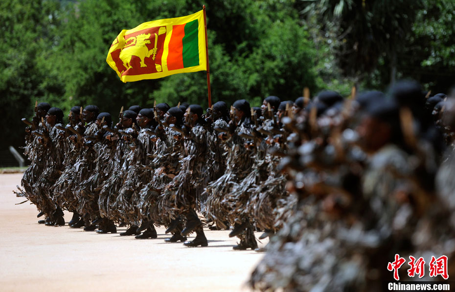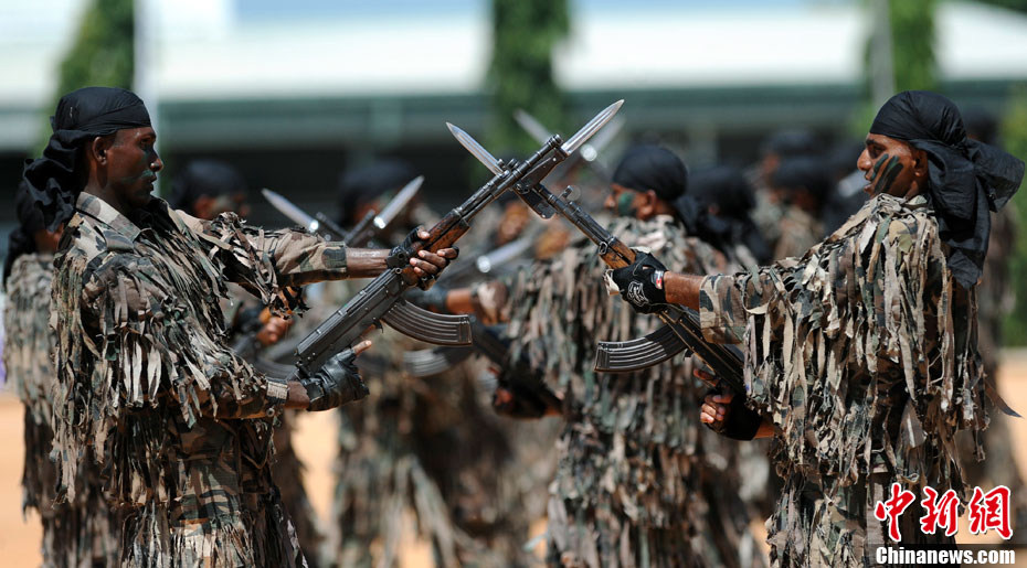 9月17日,在斯里蘭卡東北部城市亭可馬里舉行的空軍閱兵儀式上,116名空軍特種兵展示他們的各項(xiàng)技能。自2009年泰米爾猛虎組織(全稱,泰米爾·伊拉姆猛虎解放組織)的首領(lǐng)普拉巴卡蘭被擊斃,其基地被政府軍攻陷后,斯里蘭卡結(jié)束了長(zhǎng)達(dá)25年的內(nèi)戰(zhàn),軍隊(duì)實(shí)力不斷增加。