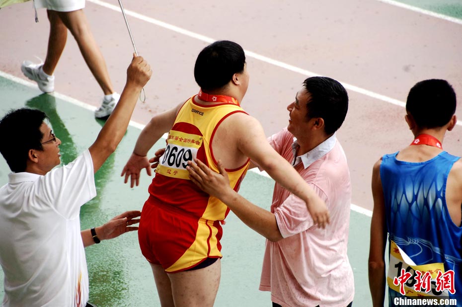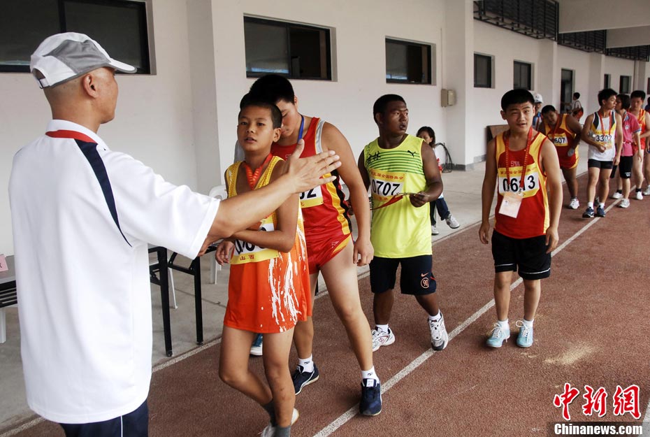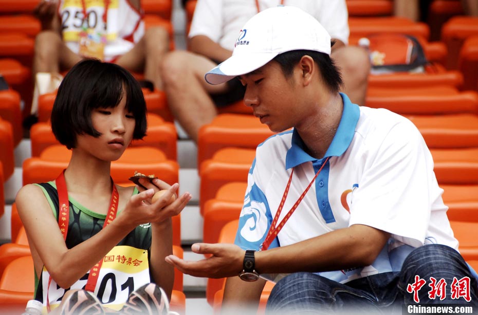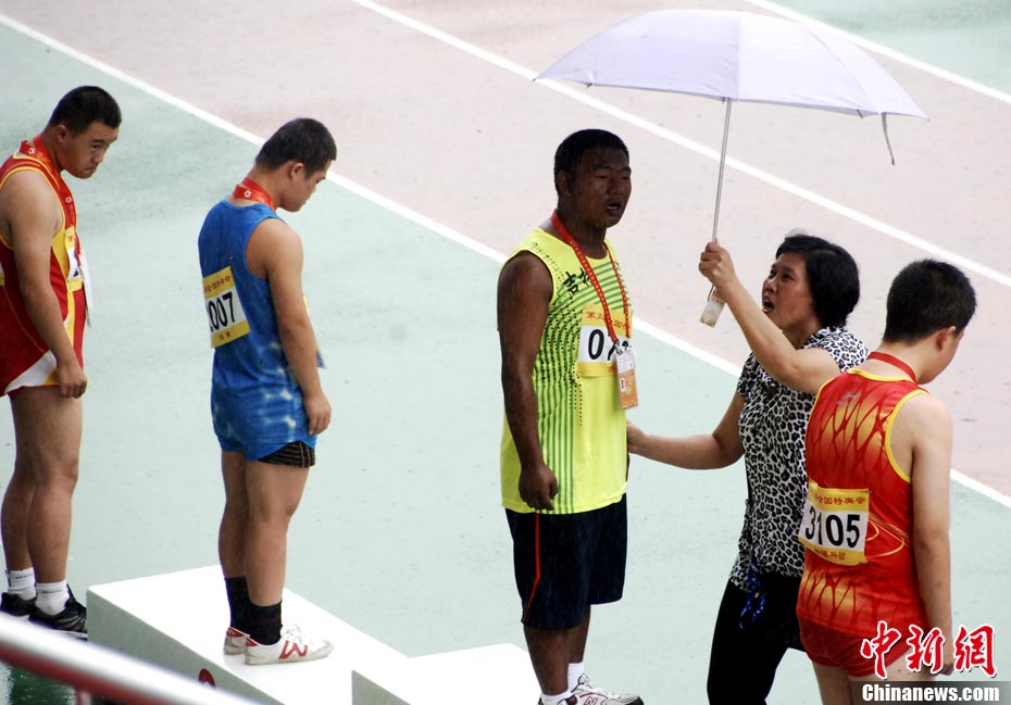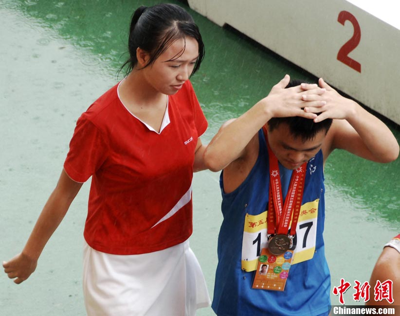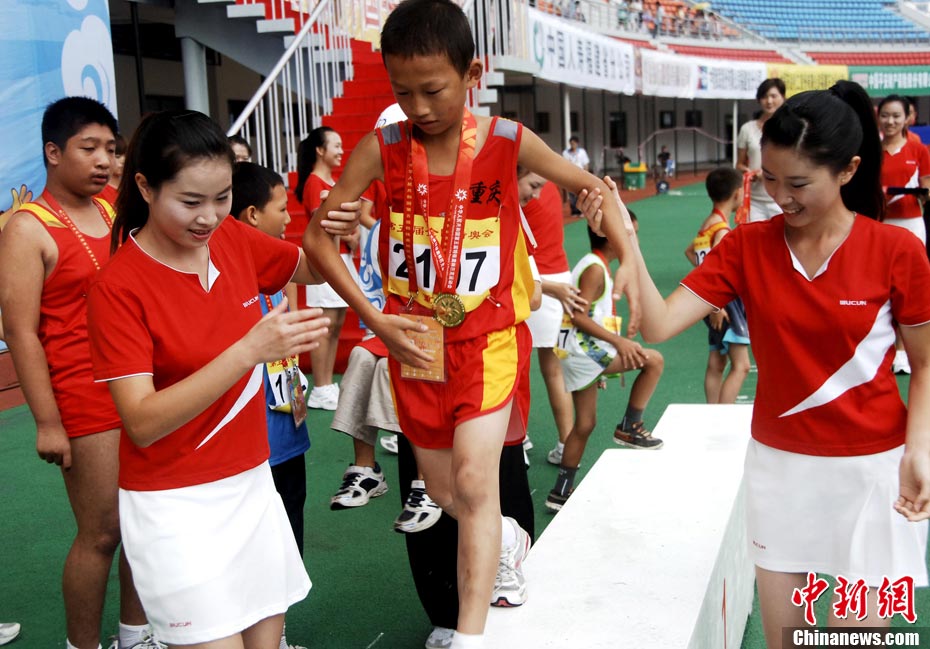 安徽特奧健兒何恩澤奪冠后與前來為他加油的媽媽和妹妹幸福相擁。王東明 攝