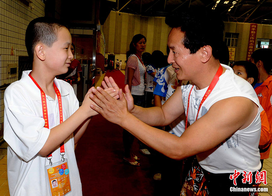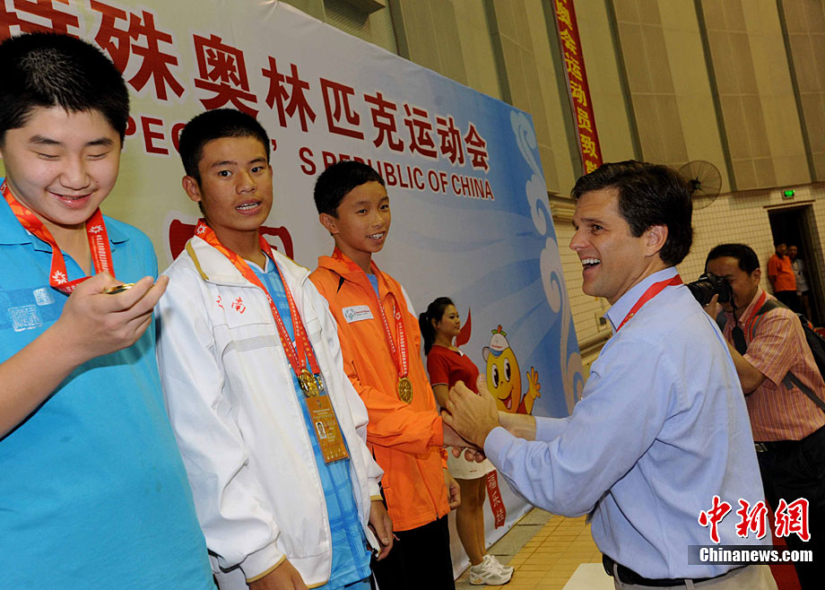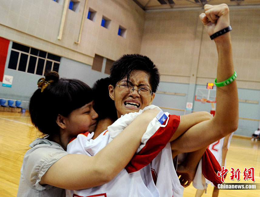 9月24日,在本屆特奧運動會男子籃球C組決賽中,福建一團(tuán)力克對手獲得冠軍。圖為比賽結(jié)束后福建一團(tuán)特奧籃球運動員張華閩、張華粵雙胞胎兄弟與一旁觀賽的母親唐秀玲相擁而泣,場面感人。劉可耕 攝