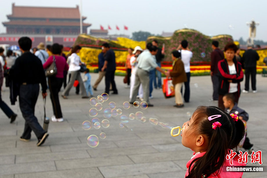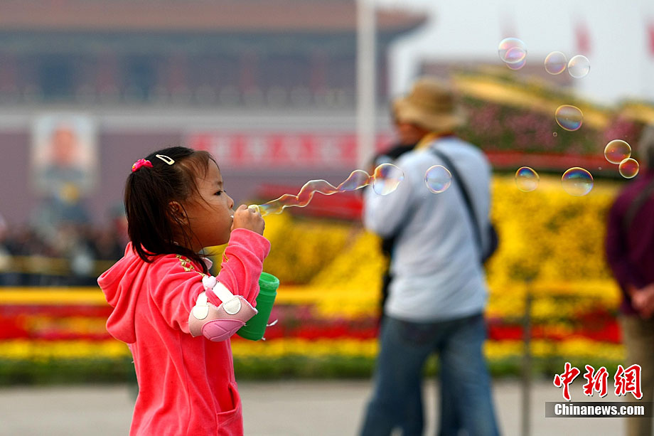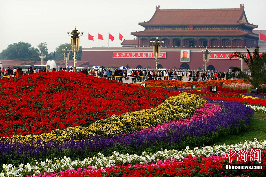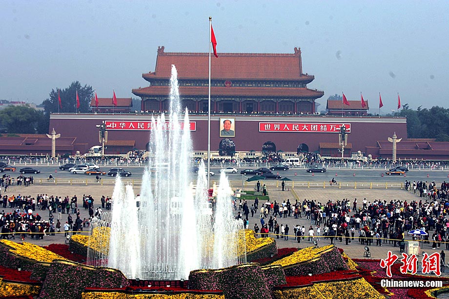9月25日上午,北京市園林綠化局宣傳中心對外宣布,為了迎接建國61周年,天安門廣場主題為“花開盛世”的中心水法花壇已經(jīng)安裝完畢并正式亮相。吳間道 攝 圖片來源:cnsphoto