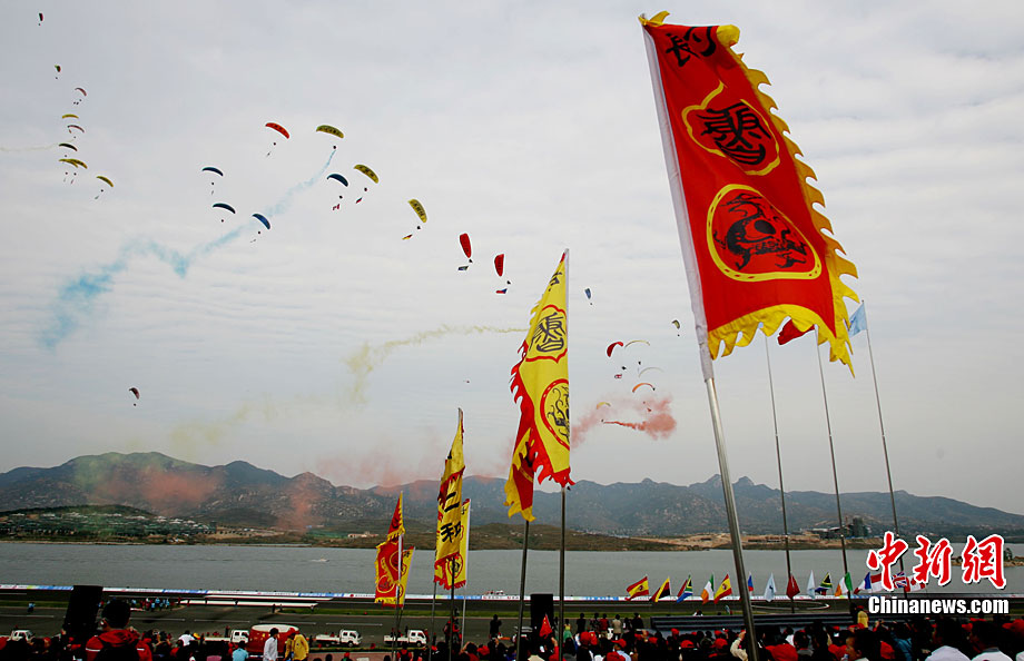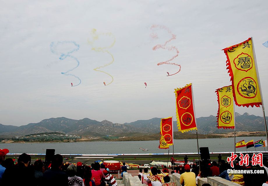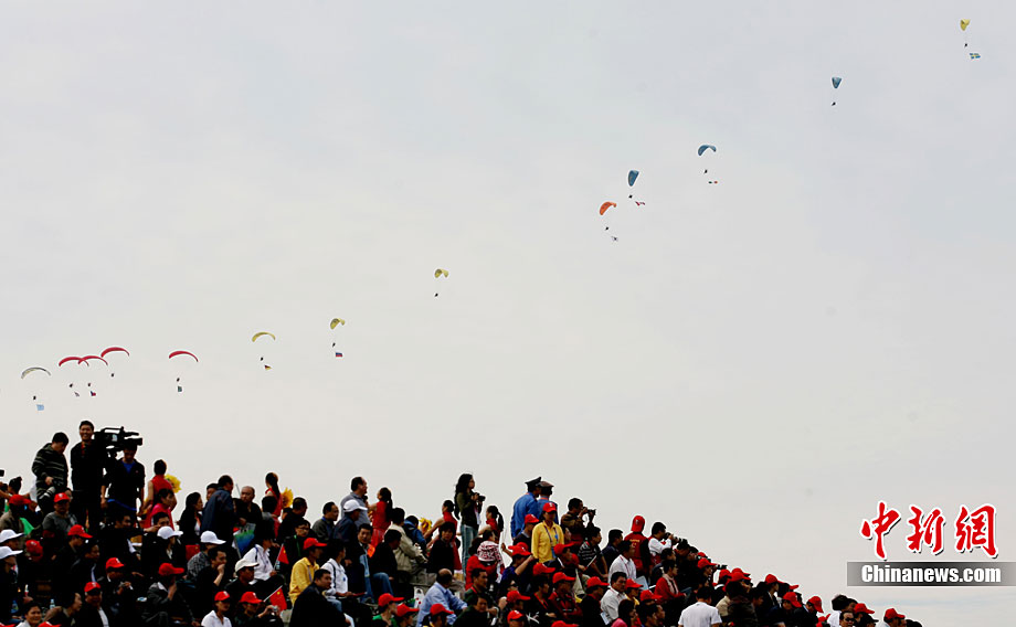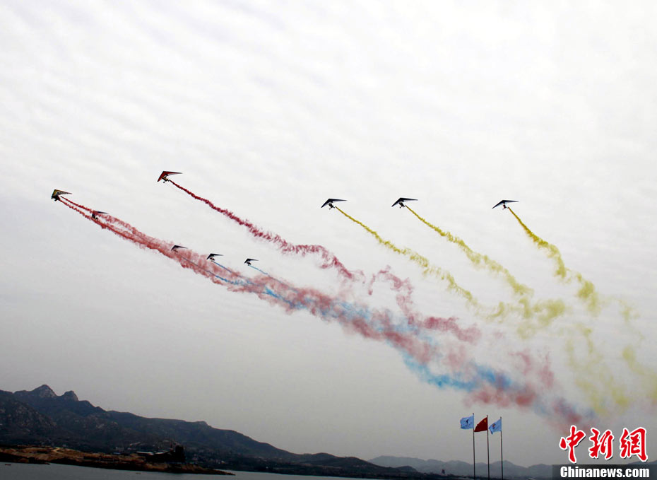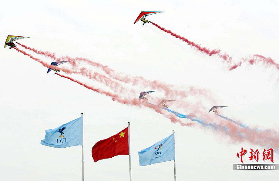 9月25日下午,2010中國國際航空體育節(jié)在山東省萊蕪市雪野旅游區(qū)拉開帷幕。來自世界18個(gè)國家的700余名航空體育高手匯聚“航空運(yùn)動(dòng)之城”萊蕪,以天空為舞臺(tái),奉獻(xiàn)了一場(chǎng)精彩的航空體育盛會(huì)。圖為三角翼飛行器當(dāng)空舞彩練。 中新社發(fā) 馬圣泉 攝